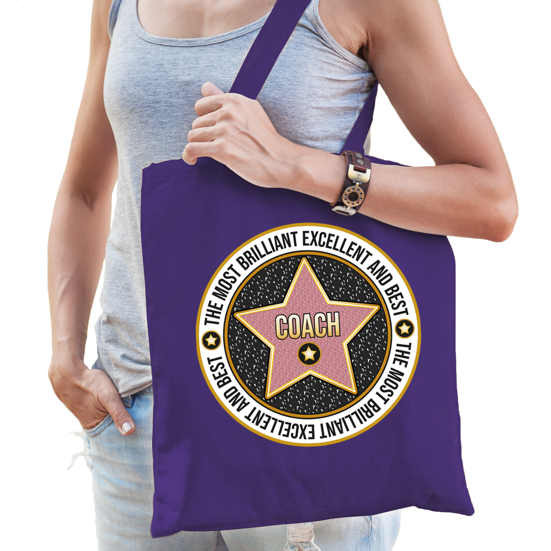 Katoenen cadeau tas voor je coach in de kleur paars. De shopper is eenzijdig bedrukt met de tekst: The most brilliant excellent and best coach, met een ster. Verdient jouw coach wel wat waardering? Geef dan dit leuke tasje cadeau! Bijvoorbeeld aan het einde van het sportseizoen of voor haar verjaardag. Een handige tote bag voor haar sportkleding. Materiaal: 100% katoen, 140 grams kwaliteit. Formaat vak: ca. 42 x 38 cm. Totale lengte inclusief hengsel: ca. 67 cm. Inhoud: ca. 10 liter. Merk: Bellatio Decorations.
