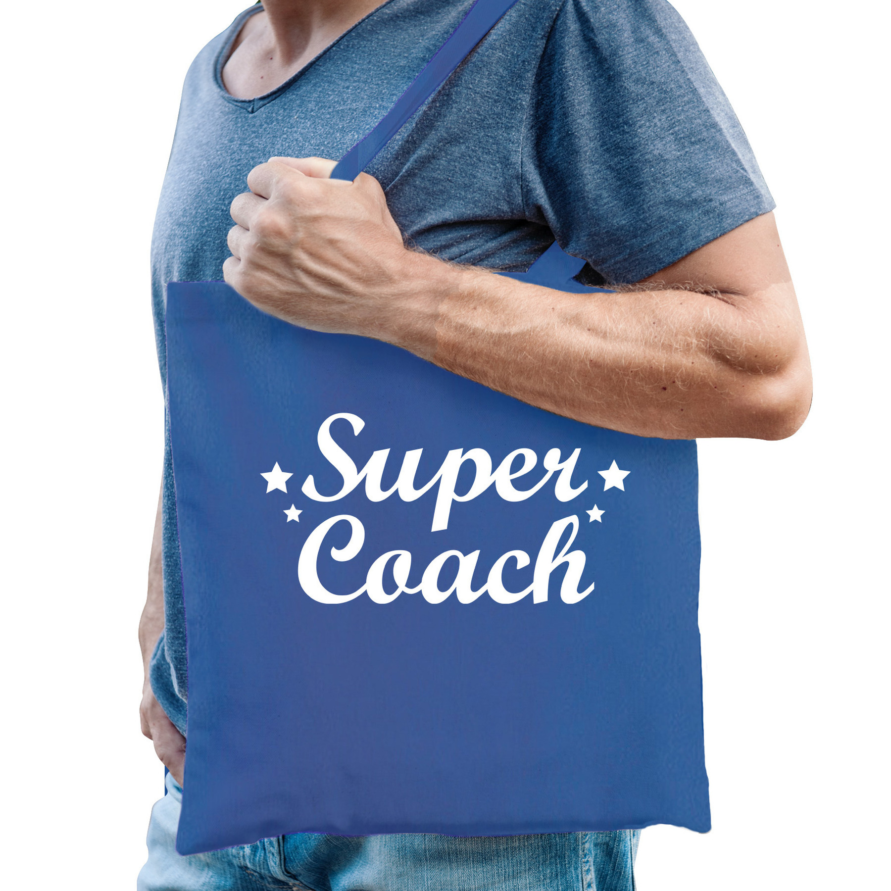 Bellatio Decorations katoenen cadeau tas/shopper/tote bag voor coach/trainers in de kleur blauw. De shopper is eenzijdig bedrukt met de tekst: super coach. Verdient jouw coach wel wat waardering? Geef dan dit leuke tasje cadeau! Bijvoorbeeld aan het einde van het sportseizoen. Materiaal: 100% katoen, 140 grams kwaliteit. Formaat vak: ca. 42 x 38 cm. Totale lengte inclusief hengsel: ca. 67 cm. Inhoud: ca. 10 liter.