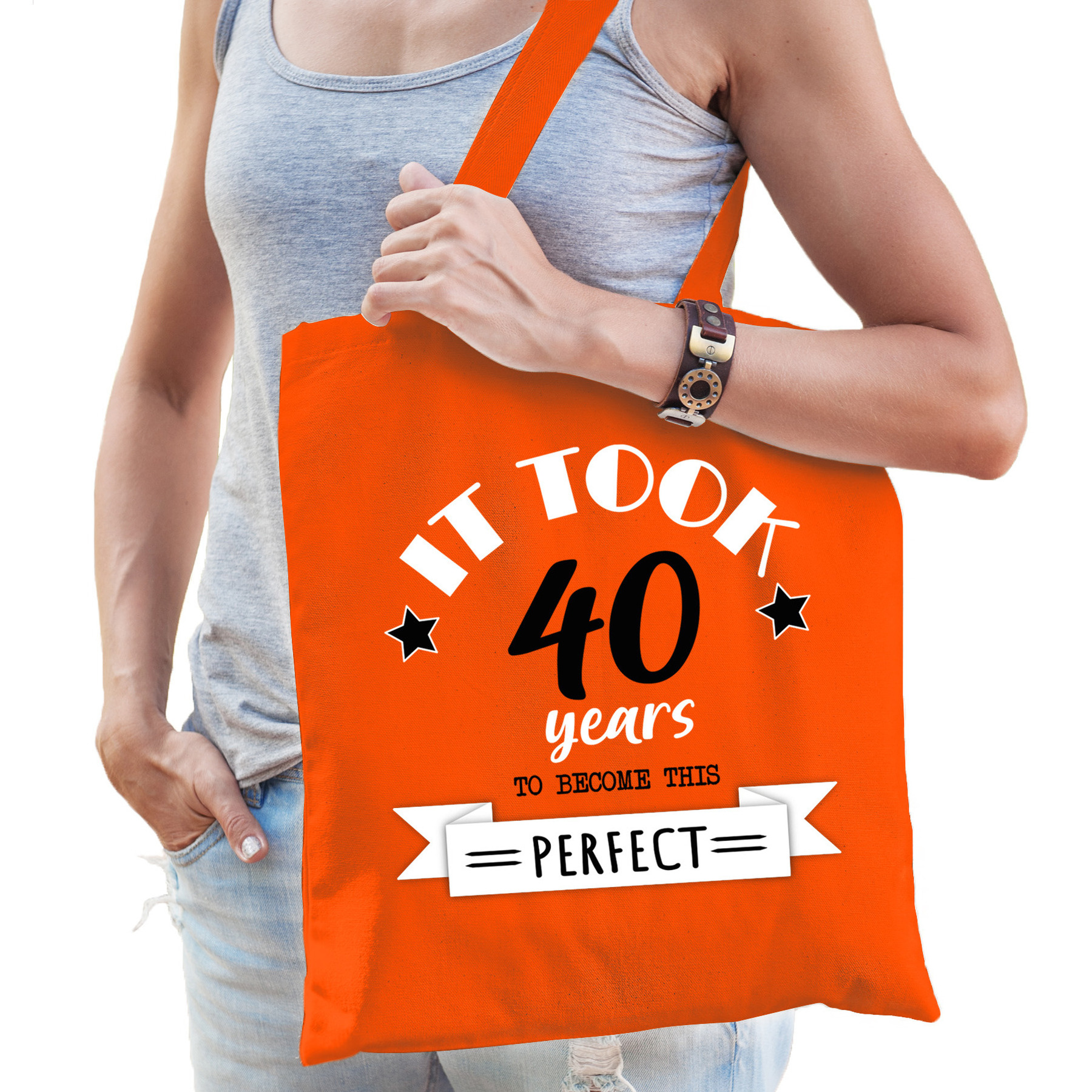 Katoenen cadeau tas/tote bag voor dames in de kleur oranje. Het perfecte cadeau voor de dame die veertig jaar is geworden! De shopper is eenzijdig bedrukt met de tekst: it took 40 years to become this perfect. Het cadeau tasje is leuk om cadeau te geven voor haar 40e verjaardag. Ook leuk om er bijvoorbeeld cadeaus in te doen en de goodiebag aan de jarige te geven!
