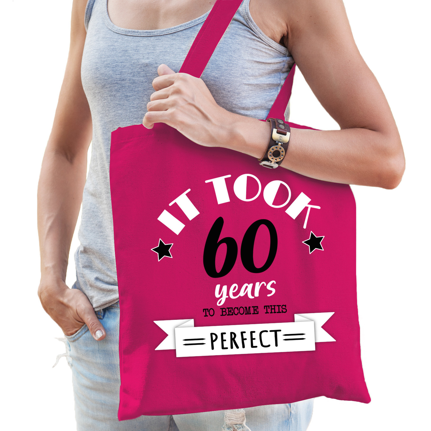 Katoenen cadeau tas/tote bag voor dames in de kleur fuchsia roze. Het perfecte cadeau voor de dame die zestig jaar is geworden! De shopper is eenzijdig bedrukt met de tekst: it took 60 years to become this perfect. Het cadeau tasje is leuk om cadeau te geven voor haar 60e verjaardag. Ook leuk om er bijvoorbeeld cadeaus in te doen en de goodiebag aan de jarige te geven!