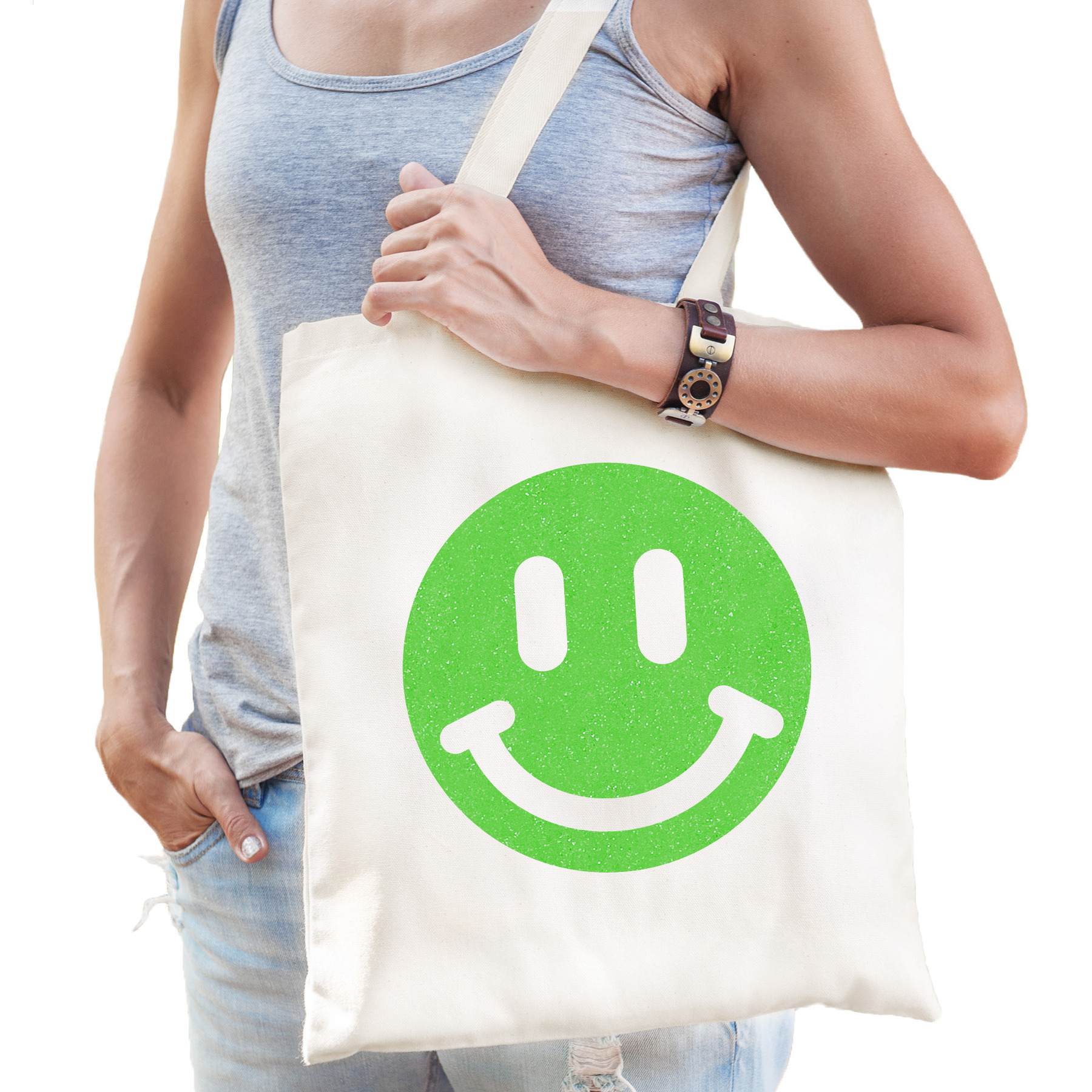 Katoenen cadeau tas voor dames in de kleur wit. De shopper is eenzijdig bedrukt met: een Smile Emoticon, in groene glitter. Geef dit leuke tasje cadeau voor Moederdag, haar verjaardag of gewoon zomaar om te laten zien dat je haar super vindt! Een handige tote bag voor haar spullen. Materiaal: 100% katoen, 140 grams kwaliteit. Formaat vak: ca. 42 x 38 cm. Totale lengte inclusief hengsel: ca. 67 cm. Inhoud: ca. 10 liter. Merk: Bellatio Decorations.