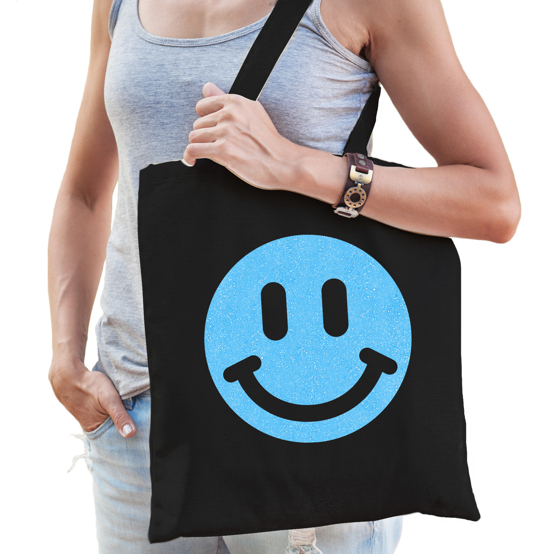 Katoenen cadeau tas voor dames in de kleur zwart. De shopper is eenzijdig bedrukt met: een Smile Emoticon, in blauwe glitter. Geef dit leuke tasje cadeau voor Moederdag, haar verjaardag of gewoon zomaar om te laten zien dat je haar super vindt! Een handige tote bag voor haar spullen. Materiaal: 100% katoen, 140 grams kwaliteit. Formaat vak: ca. 42 x 38 cm. Totale lengte inclusief hengsel: ca. 67 cm. Inhoud: ca. 10 liter. Merk: Bellatio Decorations.