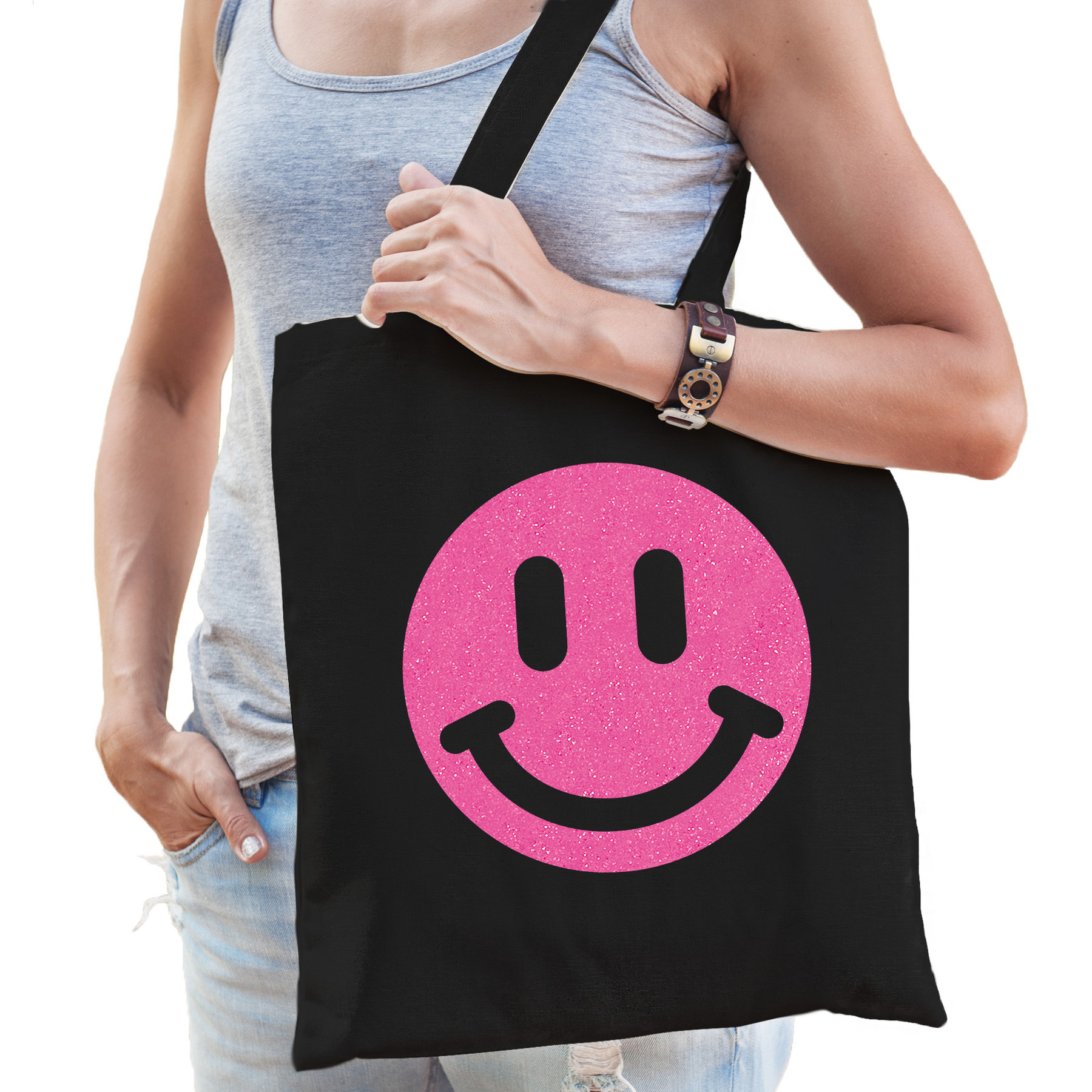 Katoenen cadeau tas voor dames in de kleur zwart. De shopper is eenzijdig bedrukt met: een Smile Emoticon, in roze glitter. Geef dit leuke tasje cadeau voor Moederdag, haar verjaardag of gewoon zomaar om te laten zien dat je haar super vindt! Een handige tote bag voor haar spullen. Materiaal: 100% katoen, 140 grams kwaliteit. Formaat vak: ca. 42 x 38 cm. Totale lengte inclusief hengsel: ca. 67 cm. Inhoud: ca. 10 liter. Merk: Bellatio Decorations.