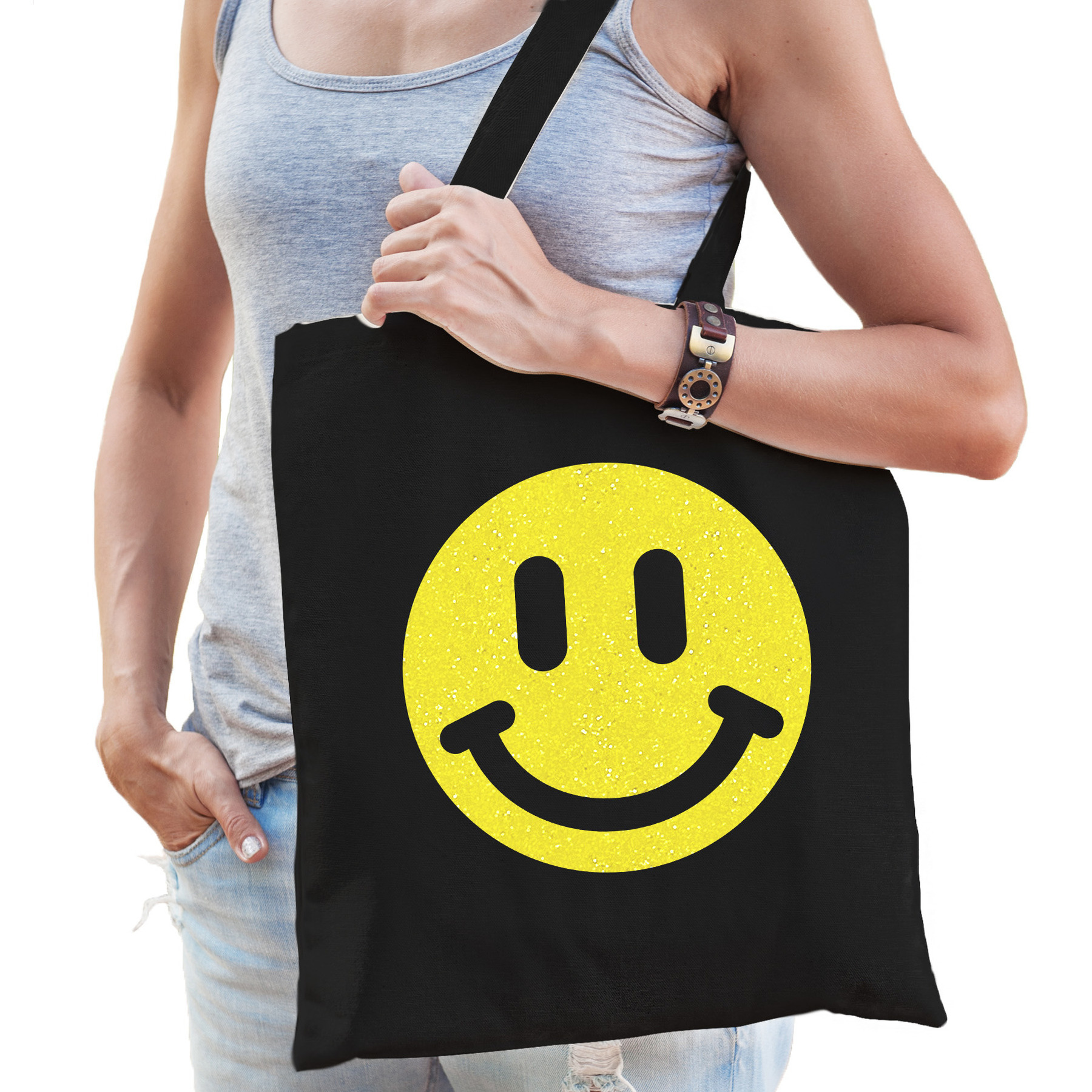 Katoenen cadeau tas voor dames in de kleur zwart. De shopper is eenzijdig bedrukt met: een Smile Emoticon, in gele glitter. Geef dit leuke tasje cadeau voor Moederdag, haar verjaardag of gewoon zomaar om te laten zien dat je haar super vindt! Een handige tote bag voor haar spullen. Materiaal: 100% katoen, 140 grams kwaliteit. Formaat vak: ca. 42 x 38 cm. Totale lengte inclusief hengsel: ca. 67 cm. Inhoud: ca. 10 liter. Merk: Bellatio Decorations.