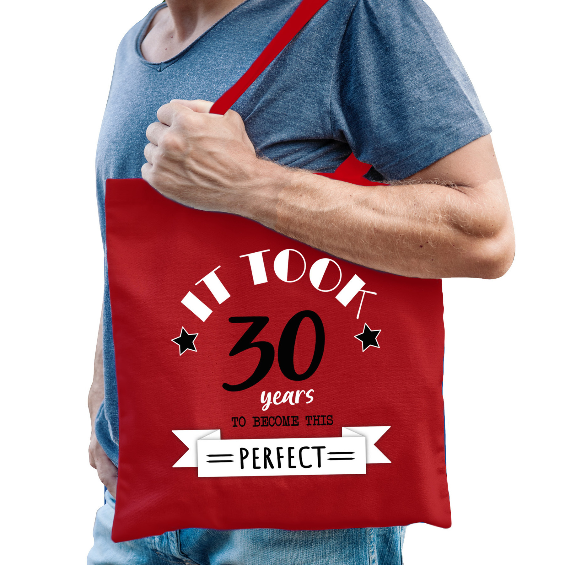 Katoenen cadeau tas/tote bag voor heren in de kleur rood. Het perfecte cadeau voor de man die dertig jaar is geworden! De shopper is eenzijdig bedrukt met de tekst: it took 30 years to become this perfect. Het cadeau tasje is leuk om cadeau te geven voor zijn 30e verjaardag. Ook leuk om er bijvoorbeeld cadeaus in te doen en de goodiebag aan de jarige te geven!