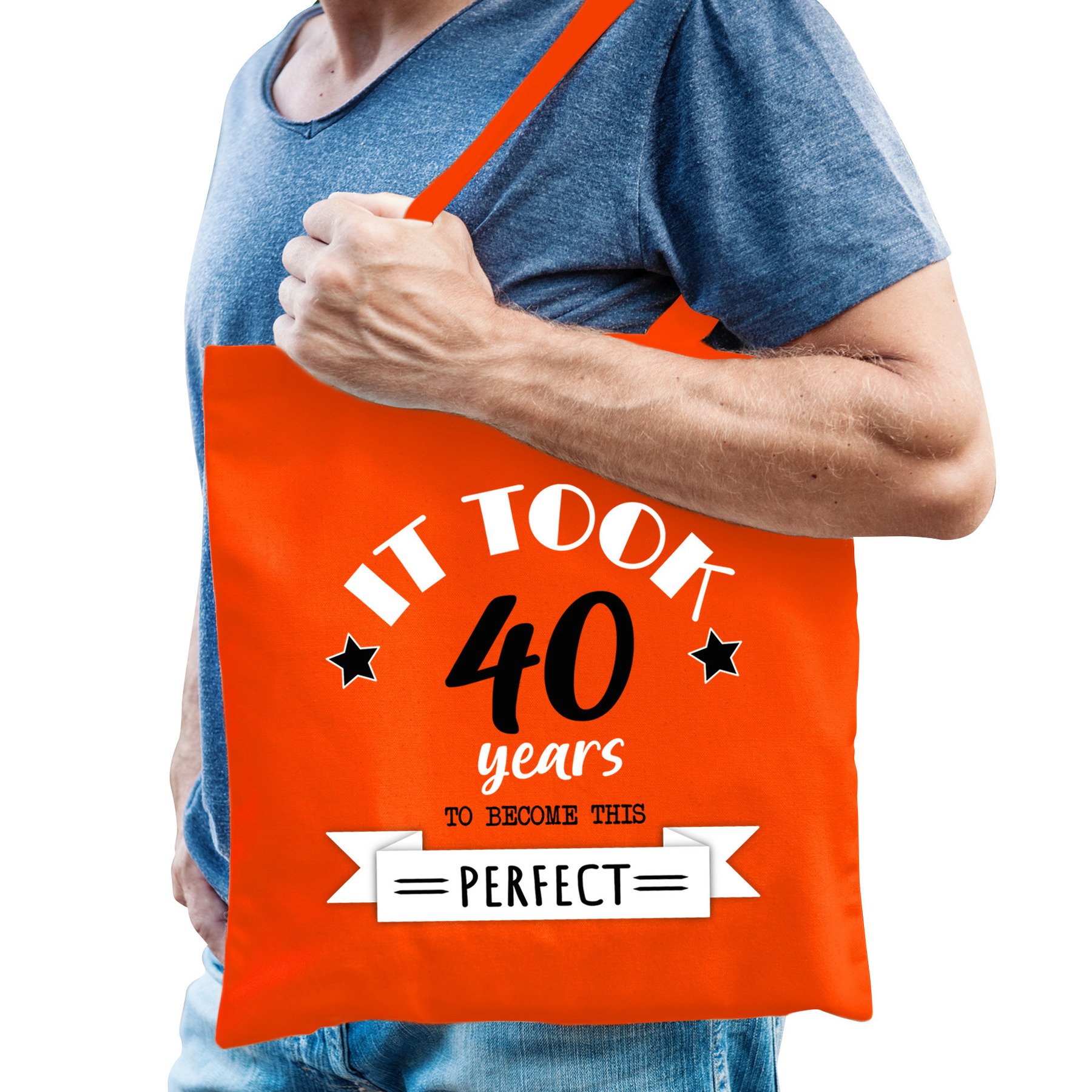 Katoenen cadeau tas/tote bag voor heren in de kleur oranje. Het perfecte cadeau voor de man die veertig jaar is geworden! De shopper is eenzijdig bedrukt met de tekst: it took 40 years to become this perfect. Het cadeau tasje is leuk om cadeau te geven voor zijn 40e verjaardag. Ook leuk om er bijvoorbeeld cadeaus in te doen en de goodiebag aan de jarige te geven!