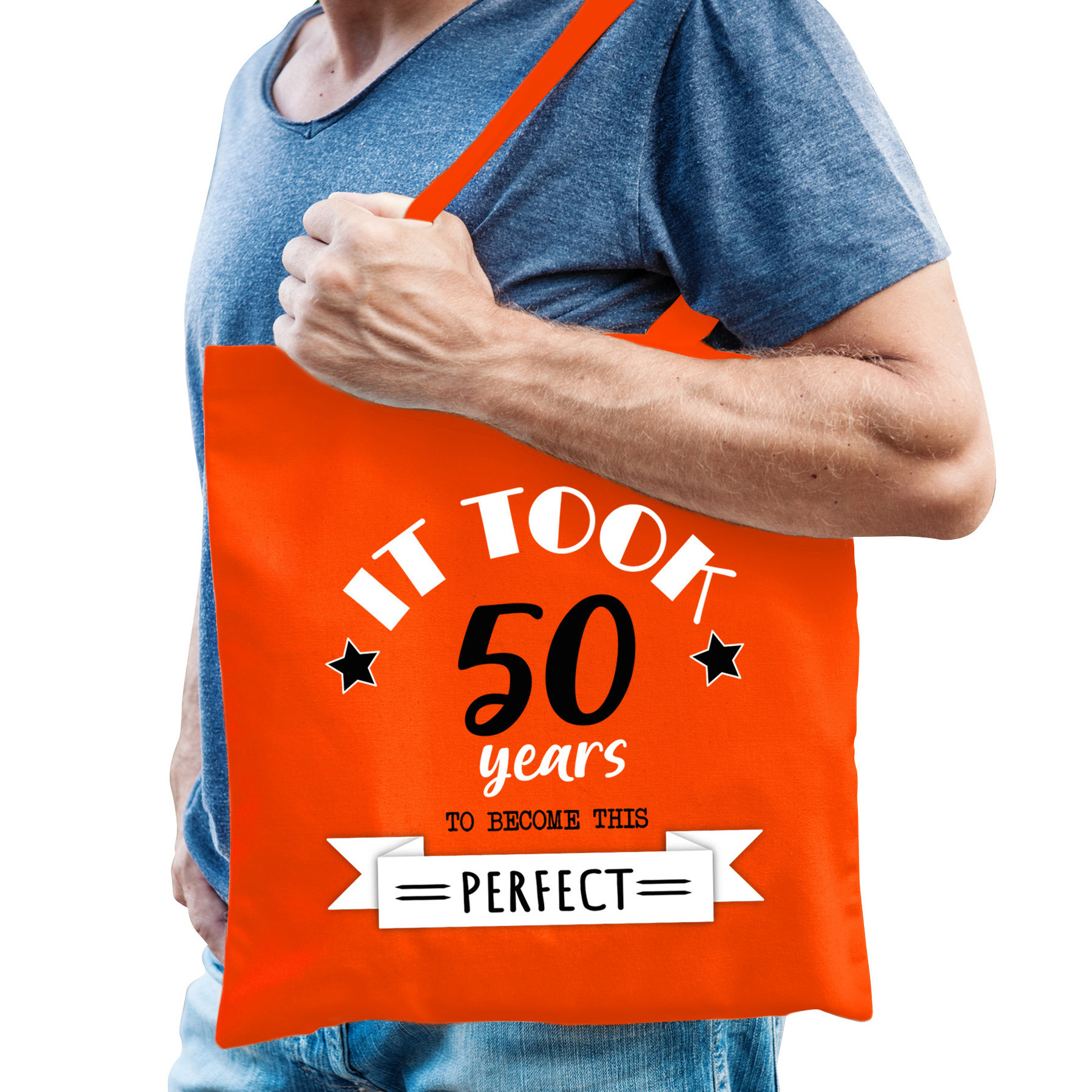 Katoenen cadeau tas/tote bag voor heren in de kleur oranje. Het perfecte cadeau voor de man die vijftig jaar is geworden! De shopper is eenzijdig bedrukt met de tekst: it took 50 years to become this perfect. Het cadeau tasje is leuk om cadeau te geven voor zijn 50e verjaardag (Abraham). Ook leuk om er bijvoorbeeld cadeaus in te doen en de goodiebag aan de jarige te geven!