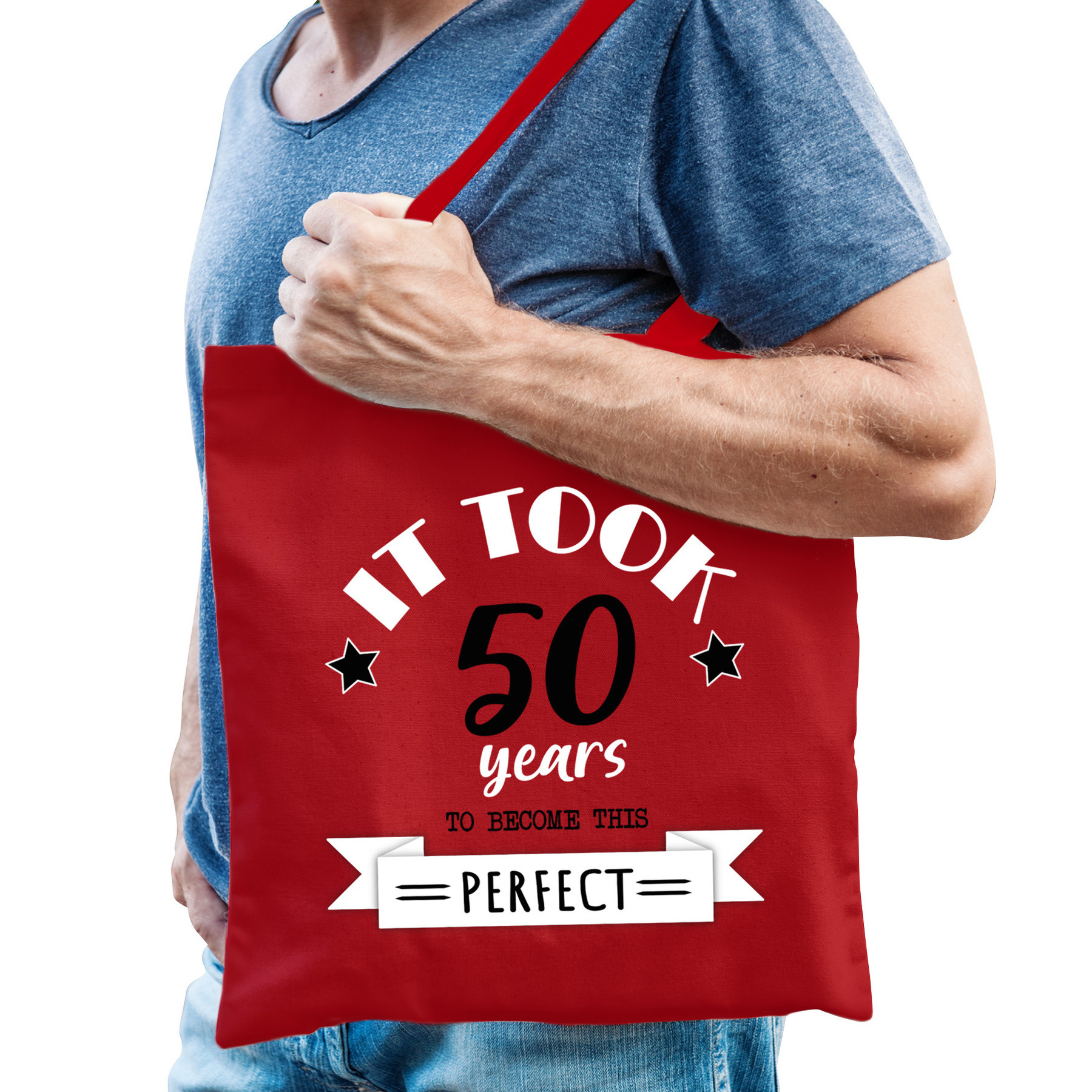 Katoenen cadeau tas/tote bag voor heren in de kleur rood. Het perfecte cadeau voor de man die vijftig jaar is geworden! De shopper is eenzijdig bedrukt met de tekst: it took 50 years to become this perfect. Het cadeau tasje is leuk om cadeau te geven voor zijn 50e verjaardag (Abraham). Ook leuk om er bijvoorbeeld cadeaus in te doen en de goodiebag aan de jarige te geven!