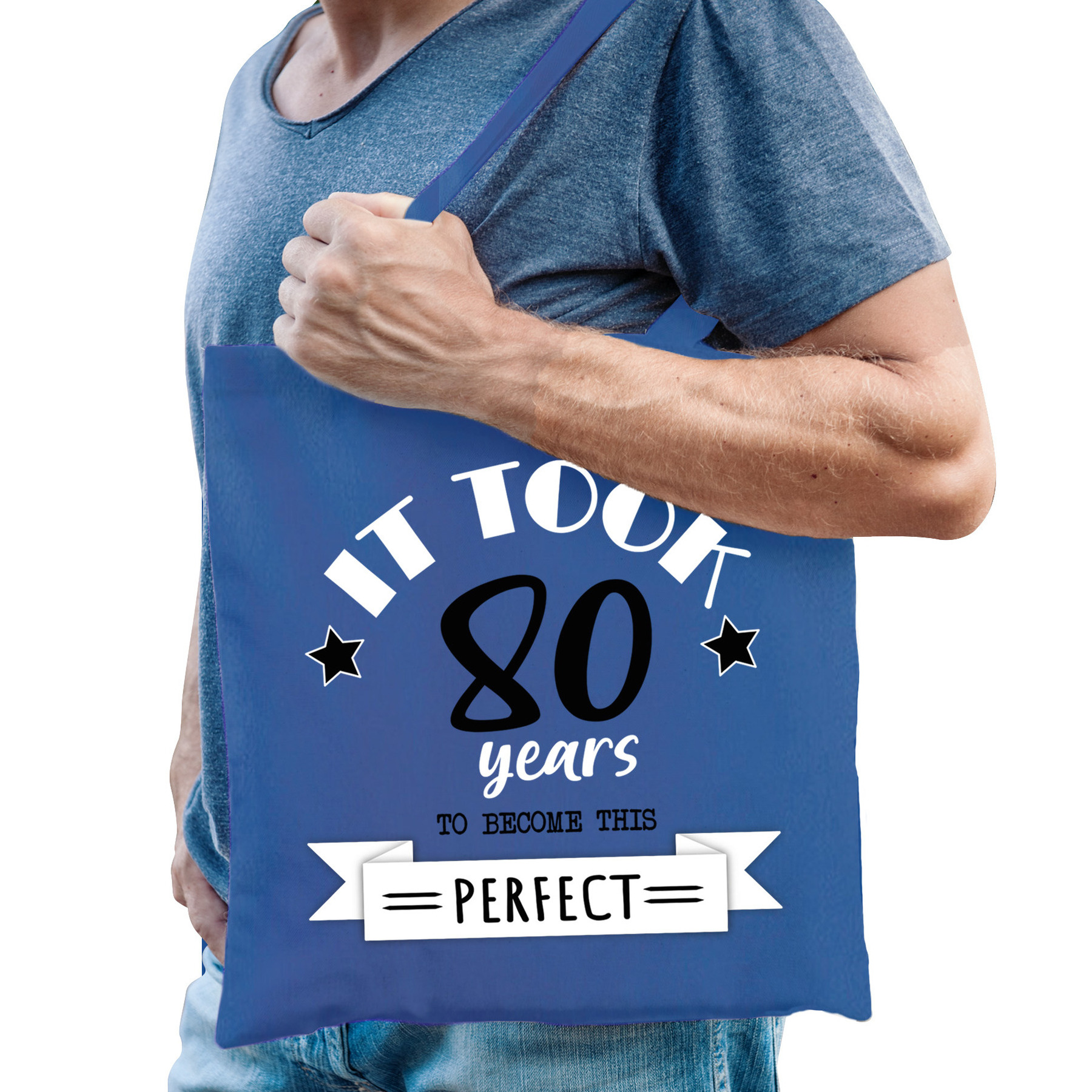 Katoenen cadeau tas/tote bag voor heren in de kleur blauw. Het perfecte cadeau voor de man die tachtig jaar is geworden! De shopper is eenzijdig bedrukt met de tekst: it took 80 years to become this perfect. Het cadeau tasje is leuk om cadeau te geven voor zijn 80e verjaardag. Ook leuk om er bijvoorbeeld cadeaus in te doen en de goodiebag aan de jarige te geven!