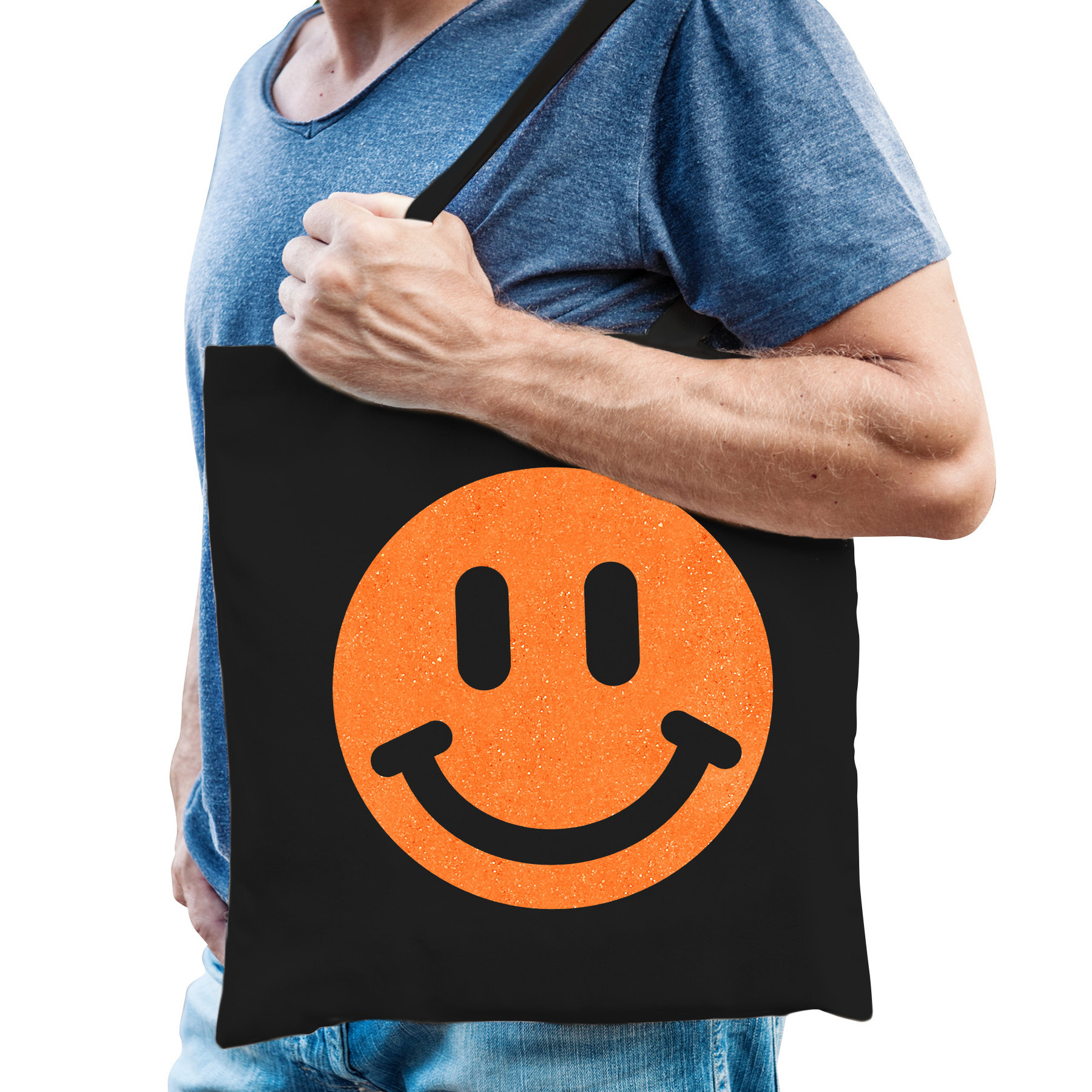 Katoenen cadeau tas voor heren in de kleur zwart. De shopper is eenzijdig bedrukt met: een Smile Emoticon, in oranje glitter. Geef dit leuke tasje cadeau voor Vaderdag, zijn verjaardag of gewoon zomaar om te laten zien dat je hem super vindt! Een handige tote bag voor zijn spullen. Materiaal: 100% katoen, 140 grams kwaliteit. Formaat vak: ca. 42 x 38 cm. Totale lengte inclusief hengsel: ca. 67 cm. Inhoud: ca. 10 liter. Merk: Bellatio Decorations.