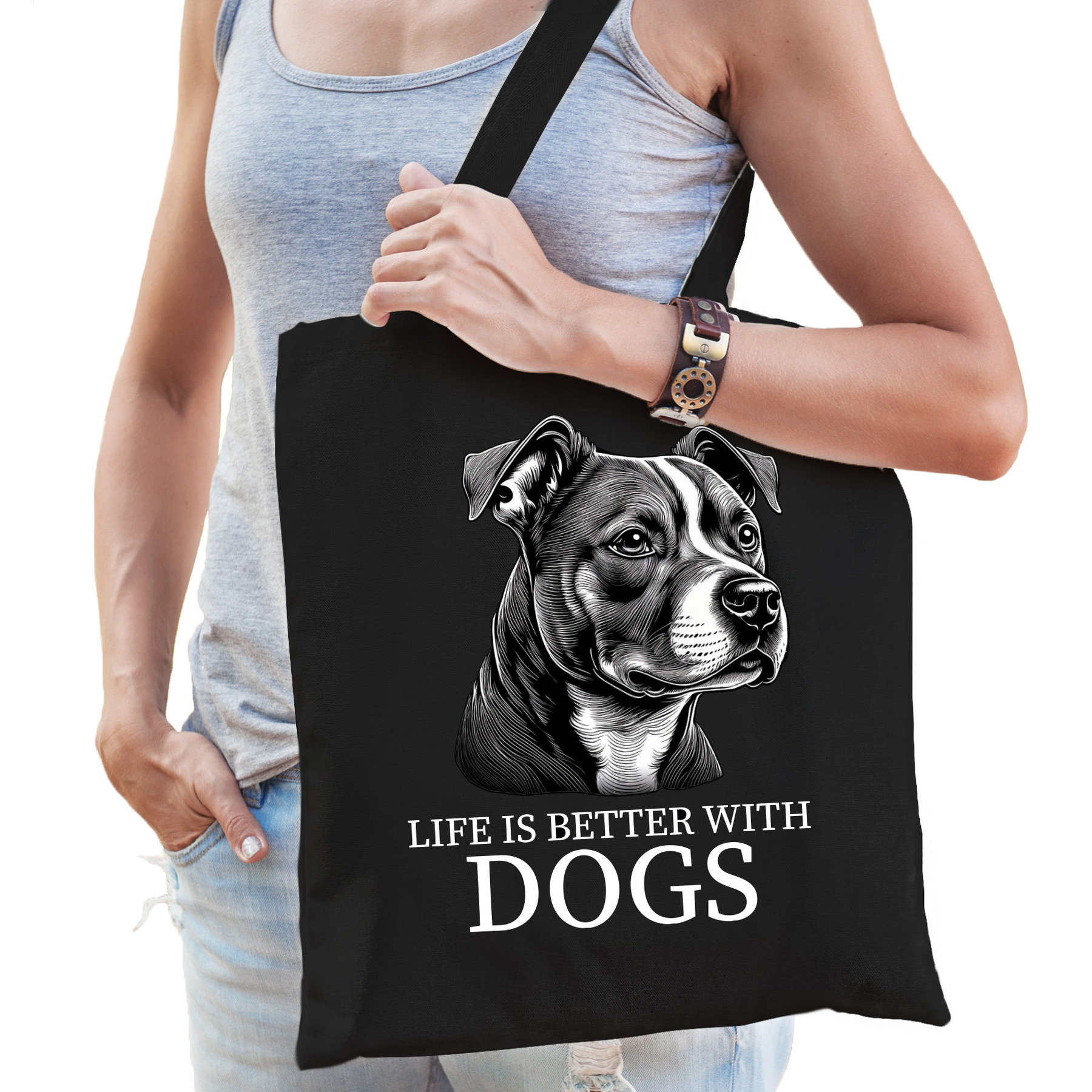Katoenen cadeau honden tas voor dames/heren en kinderen. Deze Cadeau Honden Tas is het perfecte accessoire voor hondenliefhebbers! Met een schattige afbeelding van de Staffordshire Bull Terrier hond op het zwarte katoen, is deze tas een geweldige manier om je liefde voor honden te tonen. Of je nu onderweg bent naar een uitje of boodschappen doet, de tas biedt genoeg ruimte en is ideaal voor zowel heren, dames als kinderen. Het katoen zorgt ervoor dat je tas er niet alleen stijlvol uitziet, maar ook praktisch in gebruik is. Een handige tote bag voor allerlei spullen. Materiaal: 100% katoen, 140 grams kwaliteit. Formaat vak: ca. 42 x 38 cm. Totale lengte inclusief hengsel: ca. 67 cm. Inhoud: ca. 10 liter. Merk: Bellatio Decorations.