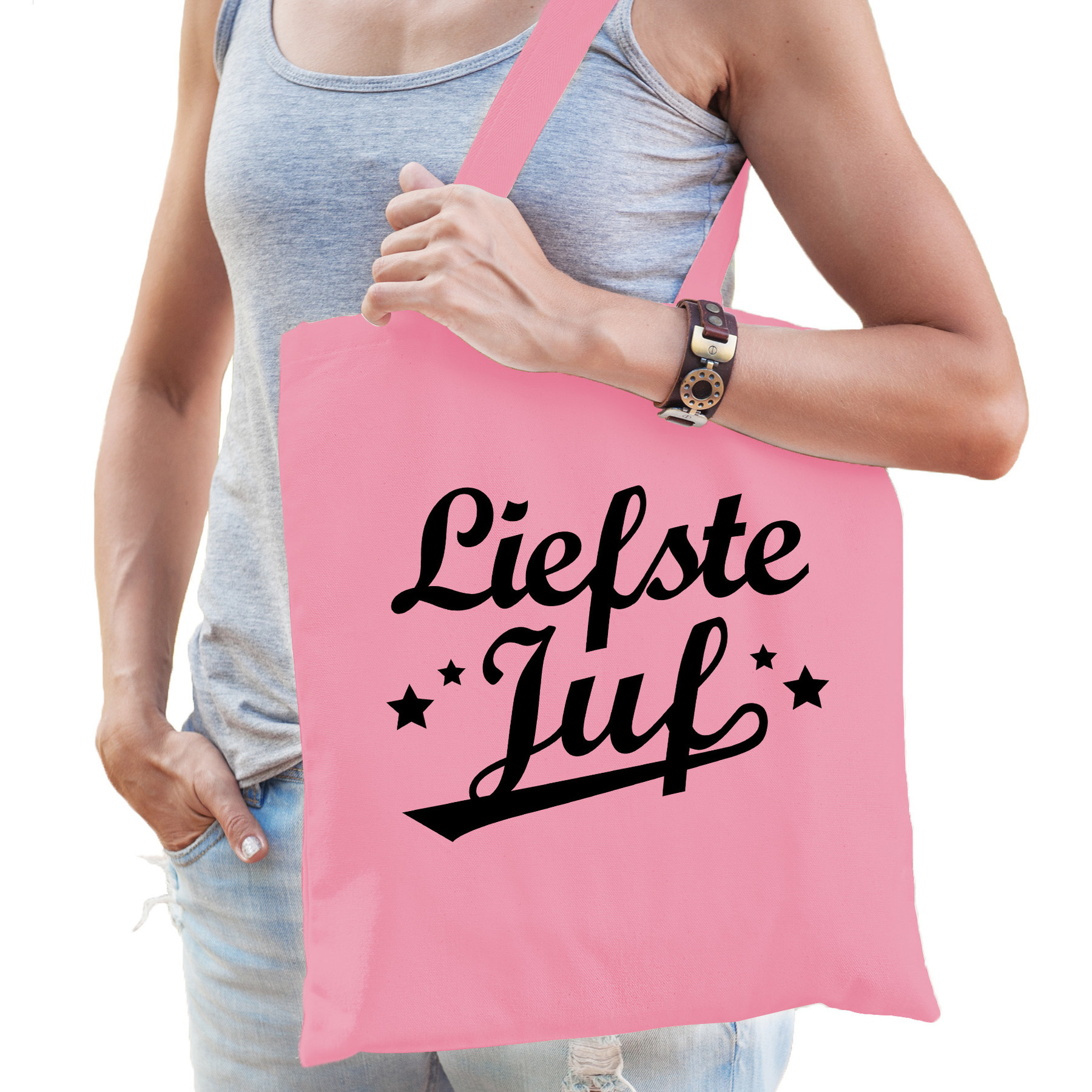 Bellatio Decorations katoenen juffendag cadeau tas/shopper/tote bag in de kleur roze. De shopper is eenzijdig bedrukt met de tekst: Liefste juf. Heb jij een hele lieve juf? Geef dit leuke tasje dan cadeau! Bijvoorbeeld met juffen en meesterdag. Materiaal: 100% katoen, 140 grams kwaliteit. Formaat vak: ca. 42 x 38 cm. Totale lengte inclusief hengsel: ca. 67 cm. Inhoud: ca. 10 liter.