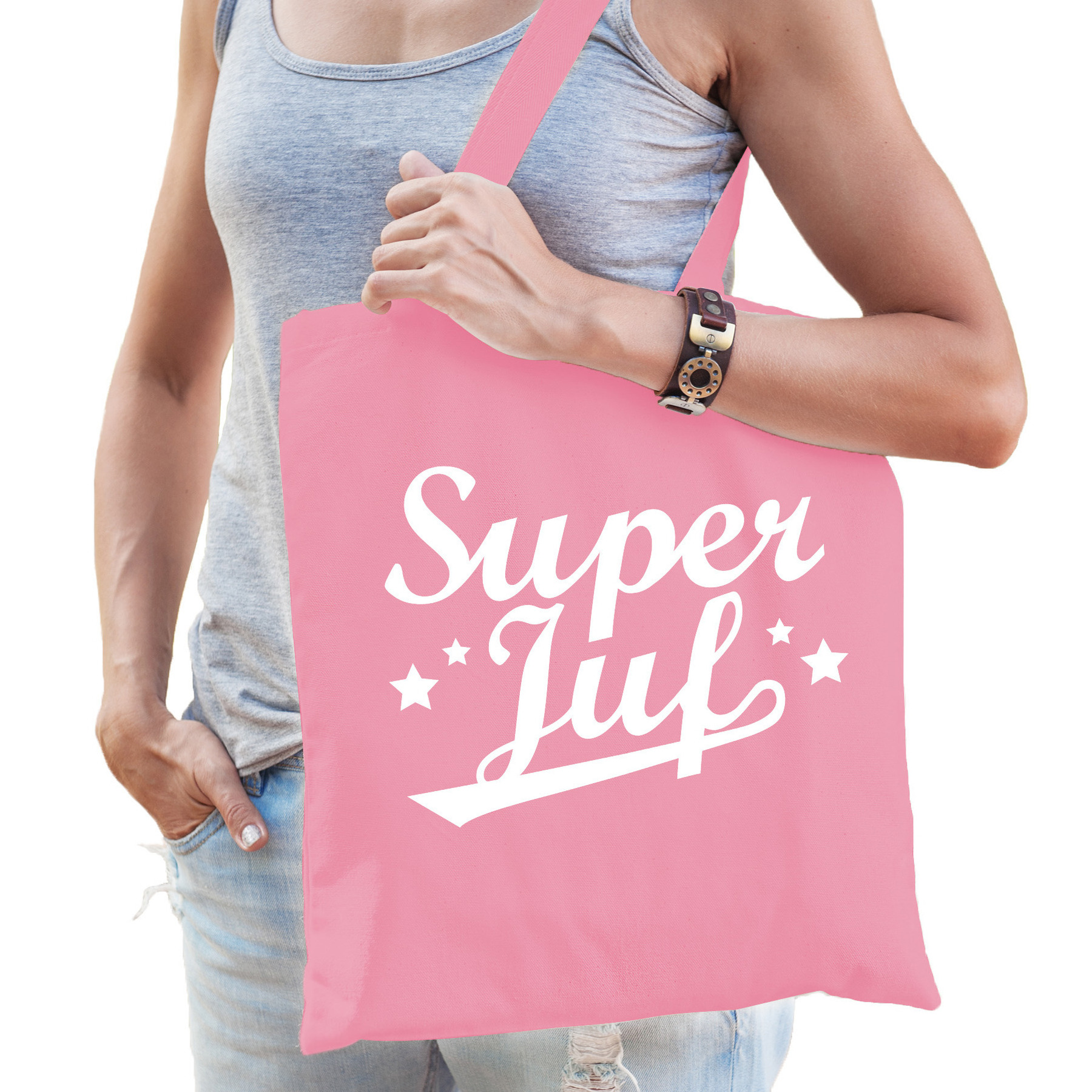 Bellatio Decorations katoenen cadeau tas/shopper/tote bag in de kleur roze. De shopper is eenzijdig bedrukt met de tekst: Super juf. Heb jij of ken jij een geweldige juf? Geef dit leuke tasje dan cadeau! Bijvoorbeeld met juffen en meesterdag. Materiaal: 100% katoen, 140 grams kwaliteit. Formaat vak: ca. 42 x 38 cm. Totale lengte inclusief hengsel: ca. 67 cm. Inhoud: ca. 10 liter.