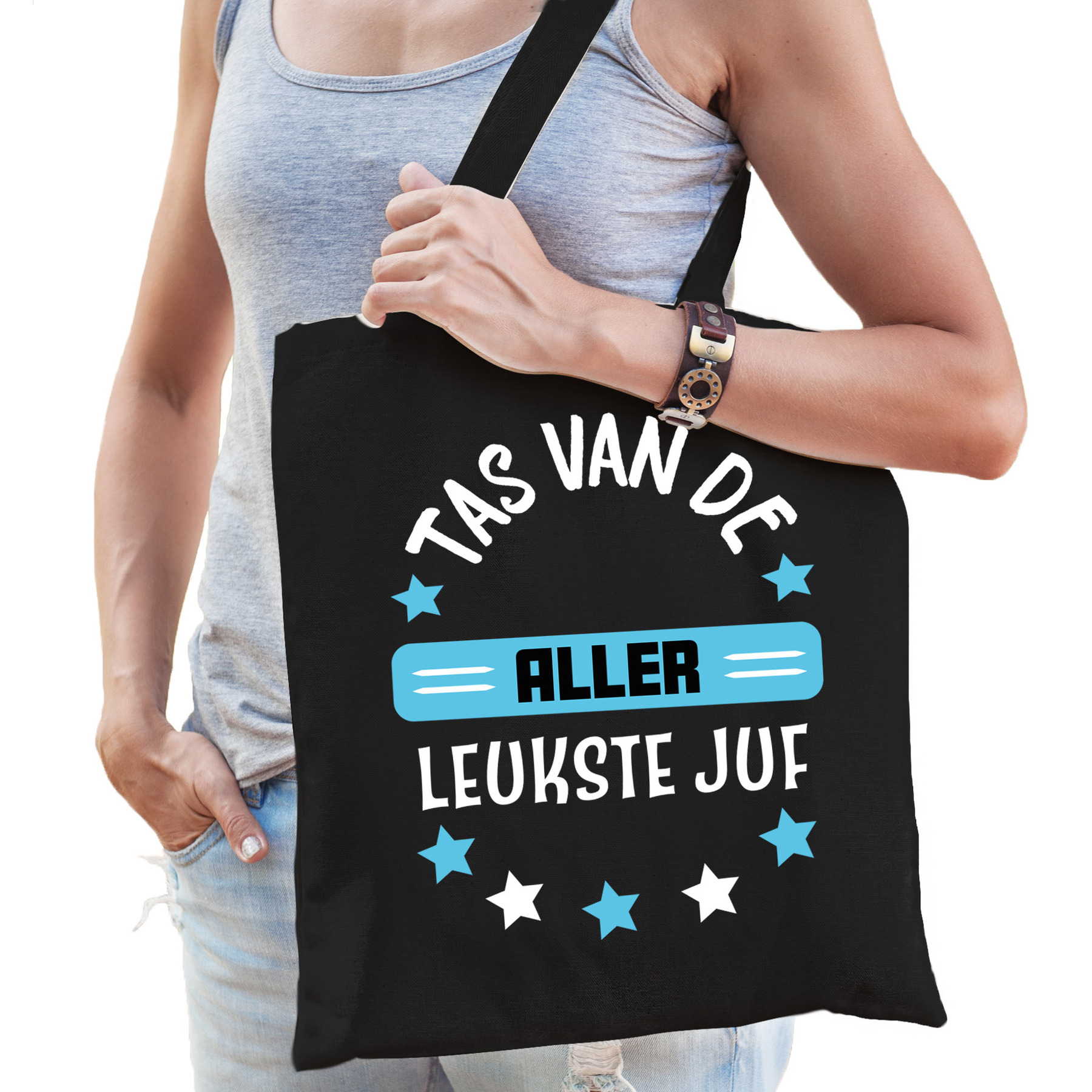 Bellatio Decorations katoenen cadeau tas/shopper/tote bag voor de aller leukste juf in de kleur zwart. De shopper is eenzijdig bedrukt met de tekst: Tas van de aller leukste juf in de kleur blauw. Is jouw juf de aller leukste? Geef dan dit leuke tasje cadeau! Bijvoorbeeld aan het einde van het schooljaar of op juffendag. Materiaal: 100% katoen, 140 grams kwaliteit. Formaat vak: ca. 42 x 38 cm. Totale lengte inclusief hengsel: ca. 67 cm. Inhoud: ca. 10 liter.