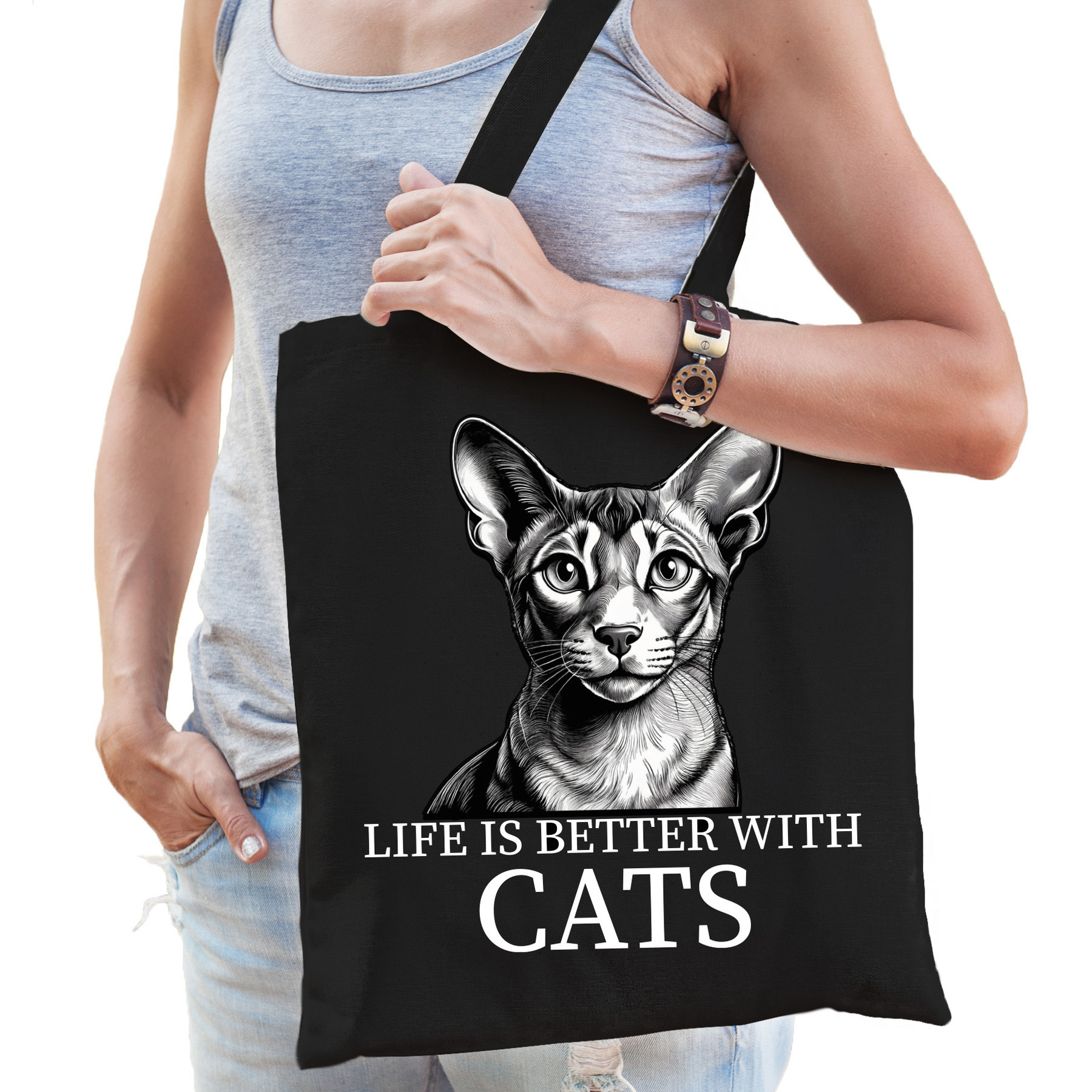 Verras een echte kattenfan met deze stijlvolle cadeau tas van de charmante Oosterse Korthaar! De zwarte katoenen tas is bedrukt met een speels kattenontwerp en maakt elke verrassing nog leuker om te geven. Of het nu als cadeauverpakking dient of als handige shopper voor kattenbrokjes, boeken of boodschappen deze tas past helemaal bij de lifestyle van een kattenliefhebber. Een handige tote bag voor allerlei spullen. Materiaal: 100% katoen, 140 grams kwaliteit. Formaat vak: ca. 42 x 38 cm. Totale lengte inclusief hengsel: ca. 67 cm. Inhoud: ca. 10 liter. Merk: Bellatio Decorations.