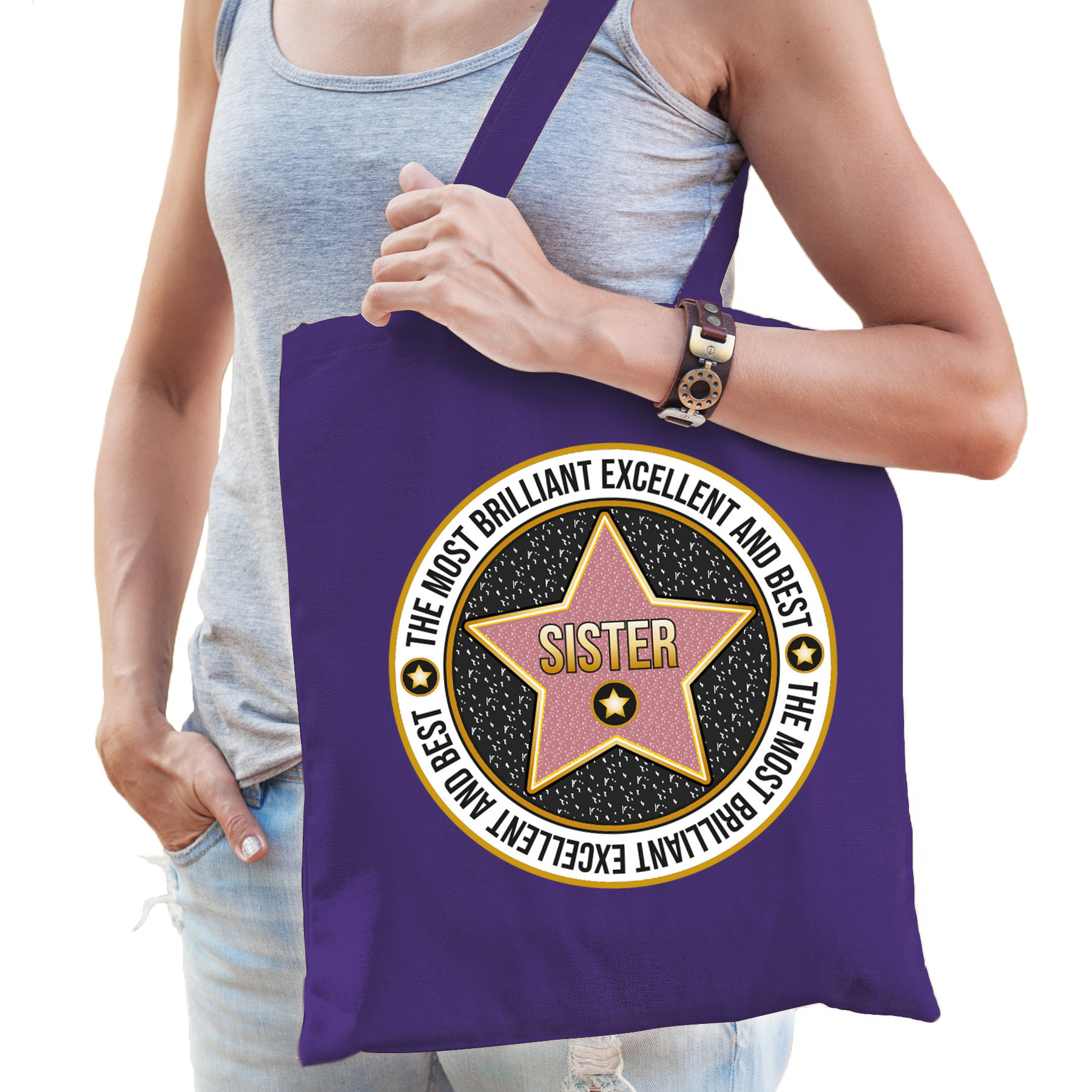Katoenen cadeau tas voor je zus in de kleur paars. De shopper is eenzijdig bedrukt met de tekst: The most brilliant excellent and best sister, met een ster. Verdient jouw zusje wel wat waardering? Geef dan dit leuke tasje cadeau! Bijvoorbeeld voor haar verjaardag. Een handige tote bag voor haar spullen. Materiaal: 100% katoen, 140 grams kwaliteit. Formaat vak: ca. 42 x 38 cm. Totale lengte inclusief hengsel: ca. 67 cm. Inhoud: ca. 10 liter. Merk: Bellatio Decorations.