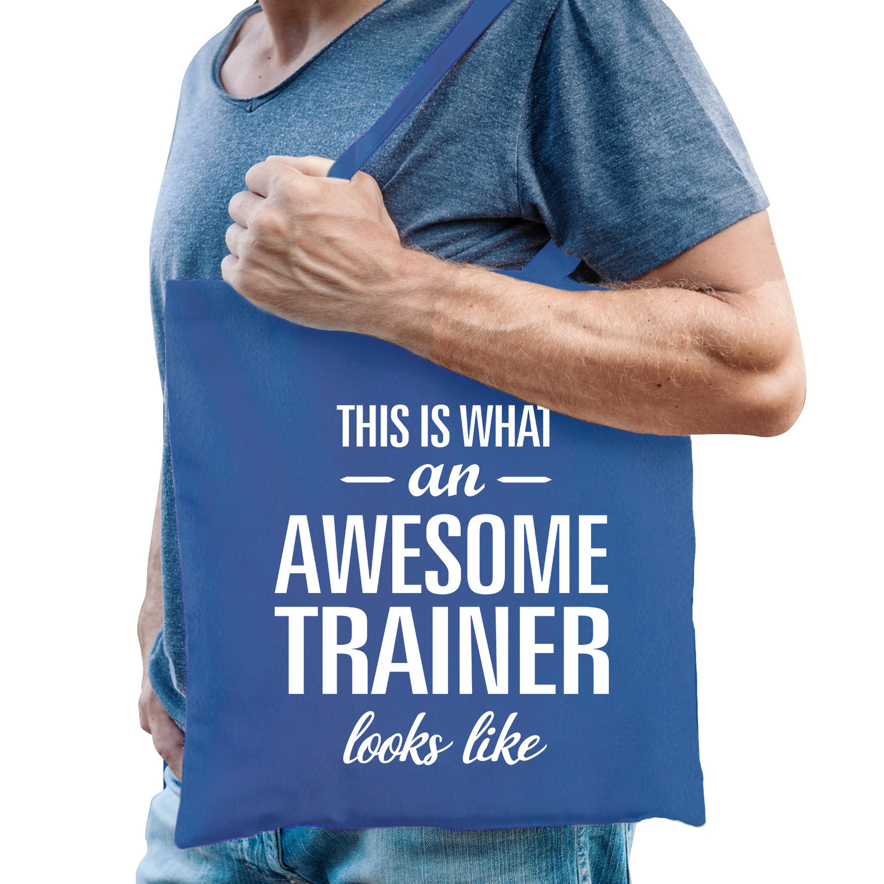 Bellatio Decorations katoenen cadeau tas/shopper/tote bag voor trainers in de kleur blauw. De shopper is eenzijdig bedrukt met de tekst: This is what an awesome trainer looks like. Verdient jouw coach wel wat waardering? Geef dan dit leuke tasje cadeau! Bijvoorbeeld aan het einde van het sportseizoen. Materiaal: 100% katoen, 140 grams kwaliteit. Formaat vak: ca. 42 x 38 cm. Totale lengte inclusief hengsel: ca. 67 cm. Inhoud: ca. 10 liter.
