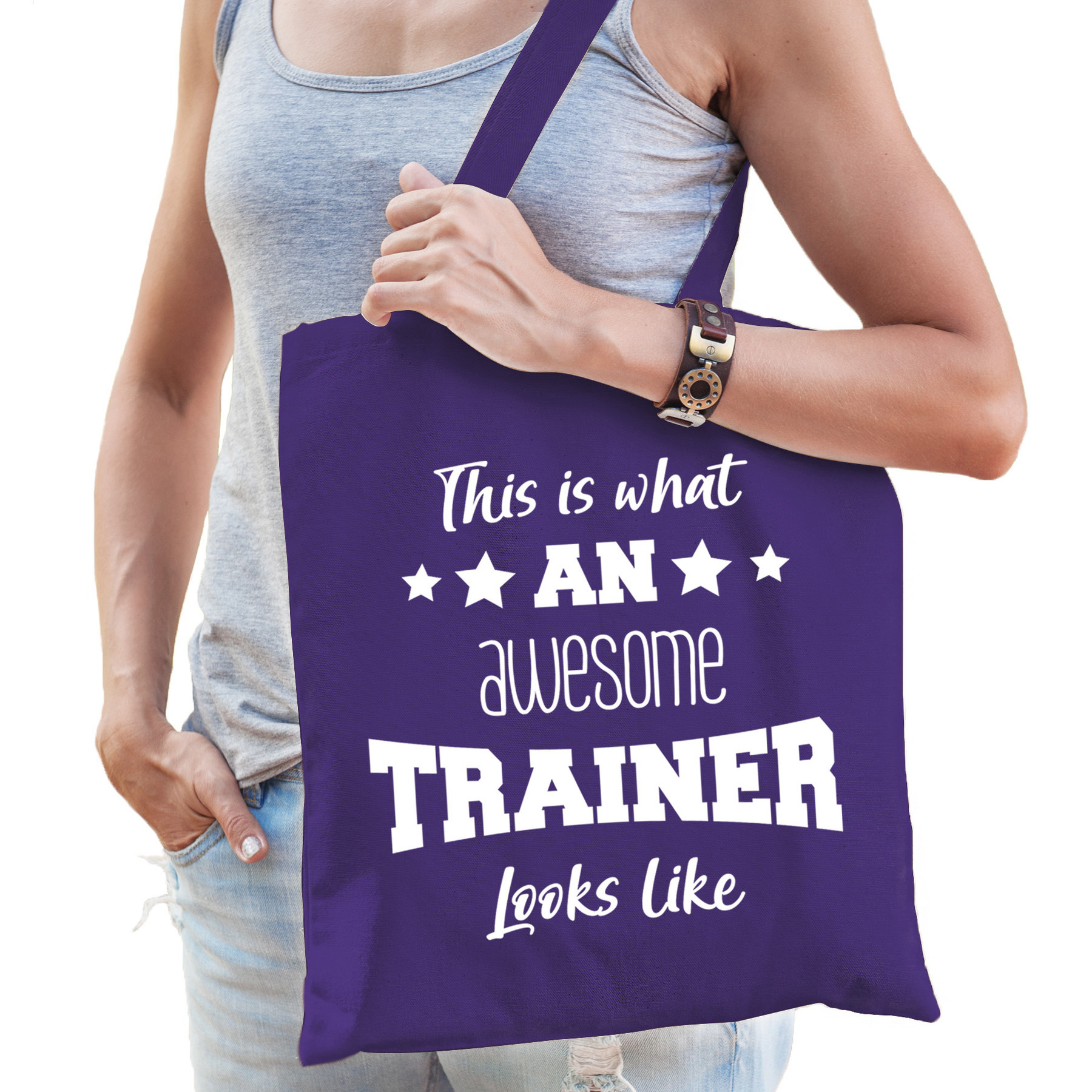 Bellatio Decorations katoenen cadeau tas/shopper/tote bag voor trainers in de kleur paars. De shopper is eenzijdig bedrukt met de tekst: This is what an awesome trainer looks like. Verdient jouw trainer wel wat waardering? Geef dan dit leuke tasje cadeau! Bijvoorbeeld aan het einde van het sportseizoen. Materiaal: 100% katoen, 140 grams kwaliteit. Formaat vak: ca. 42 x 38 cm. Totale lengte inclusief hengsel: ca. 67 cm. Inhoud: ca. 10 liter.