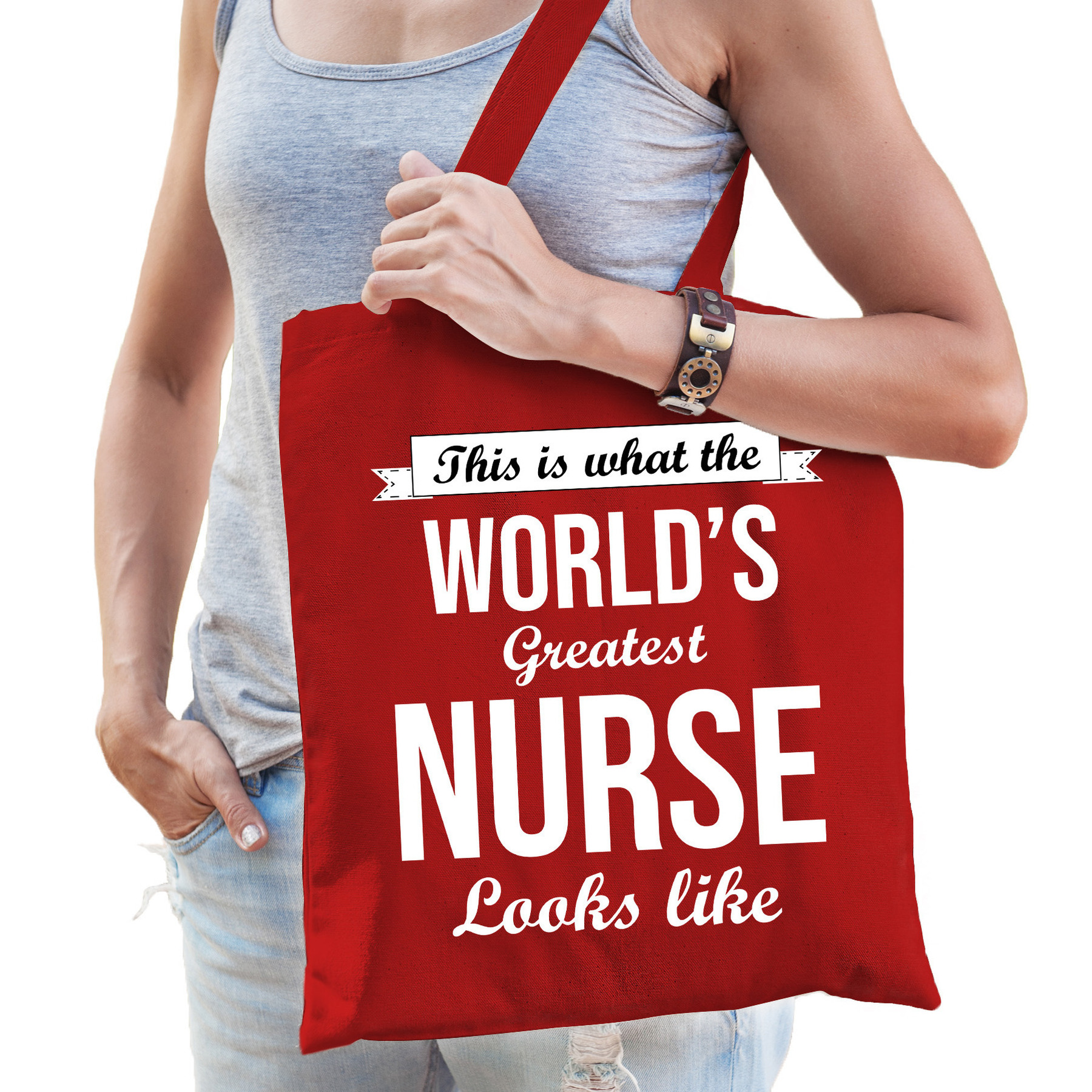 Bellatio Decorations katoenen cadeau tas/shopper/tote bag voor verpleegkundigen in de kleur rood. De shopper is eenzijdig bedrukt met de tekst: This is what the world’s greatest nurse looks like. Heb jij of ken jij een geweldige verpleegkundige/zuster? Geef dit leuke tasje dan cadeau! Ook leuk om cadeau te geven aan een net afgestudeerde/geslaagde verpleegkundige. Materiaal: 100% katoen, 140 grams kwaliteit. Formaat vak: ca. 42 x 38 cm. Totale lengte inclusief hengsel: ca. 67 cm. Inhoud: ca. 10 liter.