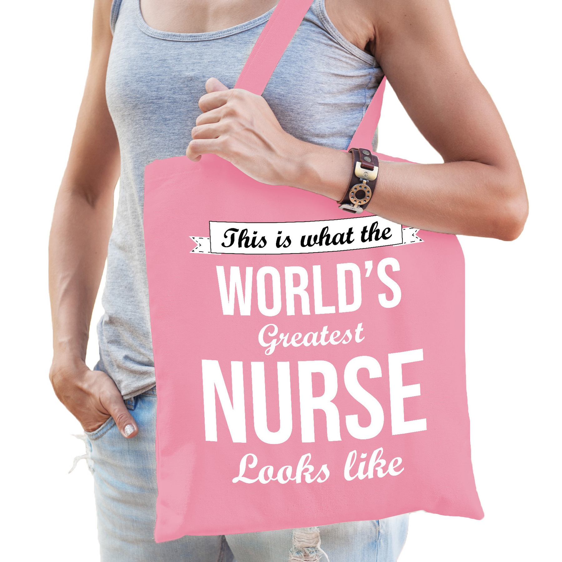 Bellatio Decorations katoenen cadeau tas/shopper/tote bag voor verpleegkundigen in de kleur roze. De shopper is eenzijdig bedrukt met de tekst: This is what the world’s greatest nurse looks like. Kent of heeft u een geweldige verpleegkundige? Geef dit leuke tasje dan cadeau! Ook leuk om cadeau te geven aan een net afgestudeerde/geslaagde verpleegkundige. Materiaal: 100% katoen, 140 grams kwaliteit. Formaat vak: ca. 42 x 38 cm. Totale lengte inclusief hengsel: ca. 67 cm. Inhoud: ca. 10 liter.
