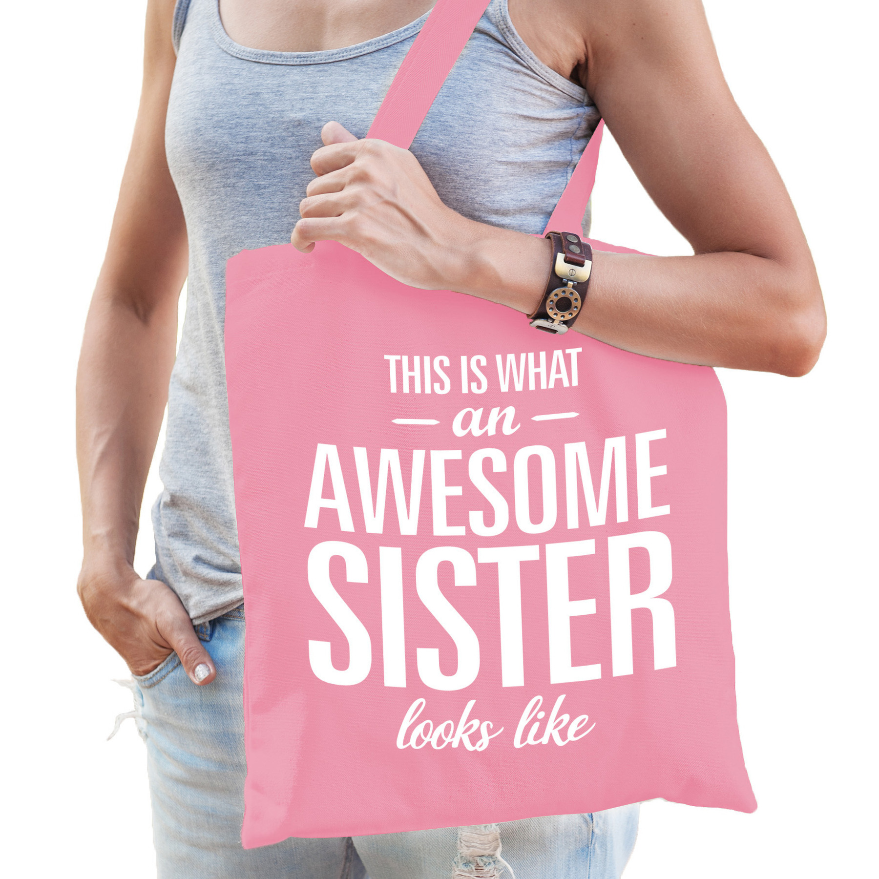 Bellatio Decorations katoenen cadeau tas/shopper/tote bag in de kleur roze. De shopper is eenzijdig bedrukt met de tekst: This is what an awesome sister looks like. Heb jij of ken jij een geweldige zus? Geef dit leuke tasje dan cadeau! Materiaal: 100% katoen, 140 grams kwaliteit. Formaat vak: ca. 42 x 38 cm. Totale lengte inclusief hengsel: ca. 67 cm. Inhoud: ca. 10 liter.