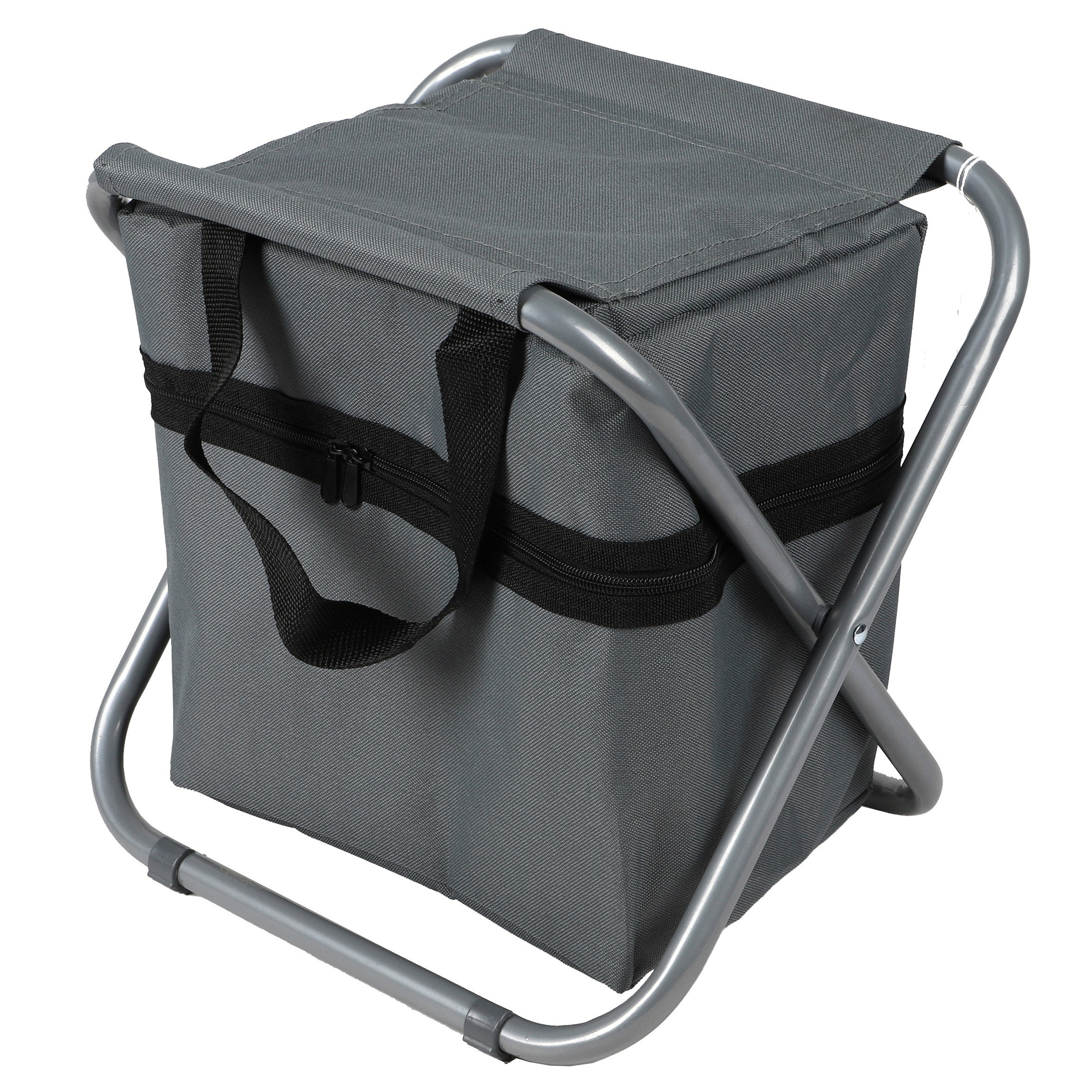 Camping/outdoor zit krukje met koeltas ineen. Het krukje is inklapbaar. Kleur: grijs. Afmetingen: 33 x 27 x 35 cm. Materiaal: metaal en polyester. De koeltas heeft een rits en isolerend binnenvak welke u ook als opberg vak kan gebruiken voor andere spullen.