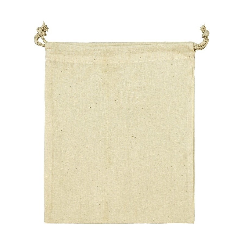 Canvas opbergzakje met koordje. Het zakje heeft verstevigde stiksels bij de handvaten. Geschikt om te borduren en te bedrukken. Formaat: ca. 10 x 14 cm. Bedrukbaar formaat: ca. 7 x 10 cm. Materiaal: 100% katoen, 140 grams kwaliteit. Kleur: beige.