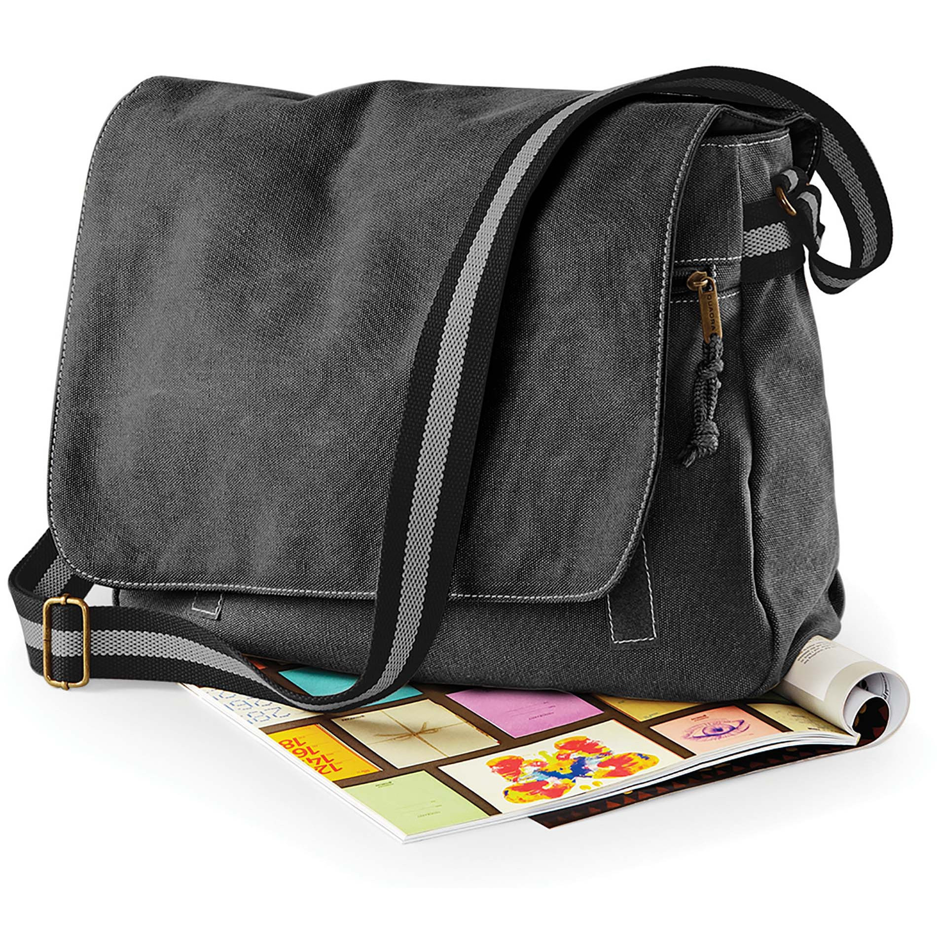 Canvas schoudertas in de kleur zwart van 14 liter. Vintage schoudertas met klittenbandsluiting en een verstelbare schouderband gemaakt van gewassen canvas, voorzien van bronskleurige klemmen. Het hoofdcompartiment is voorzien van een ritssluiting, de flap van klittenbandsluiting en de tas heeft een verstevigde onderkant.