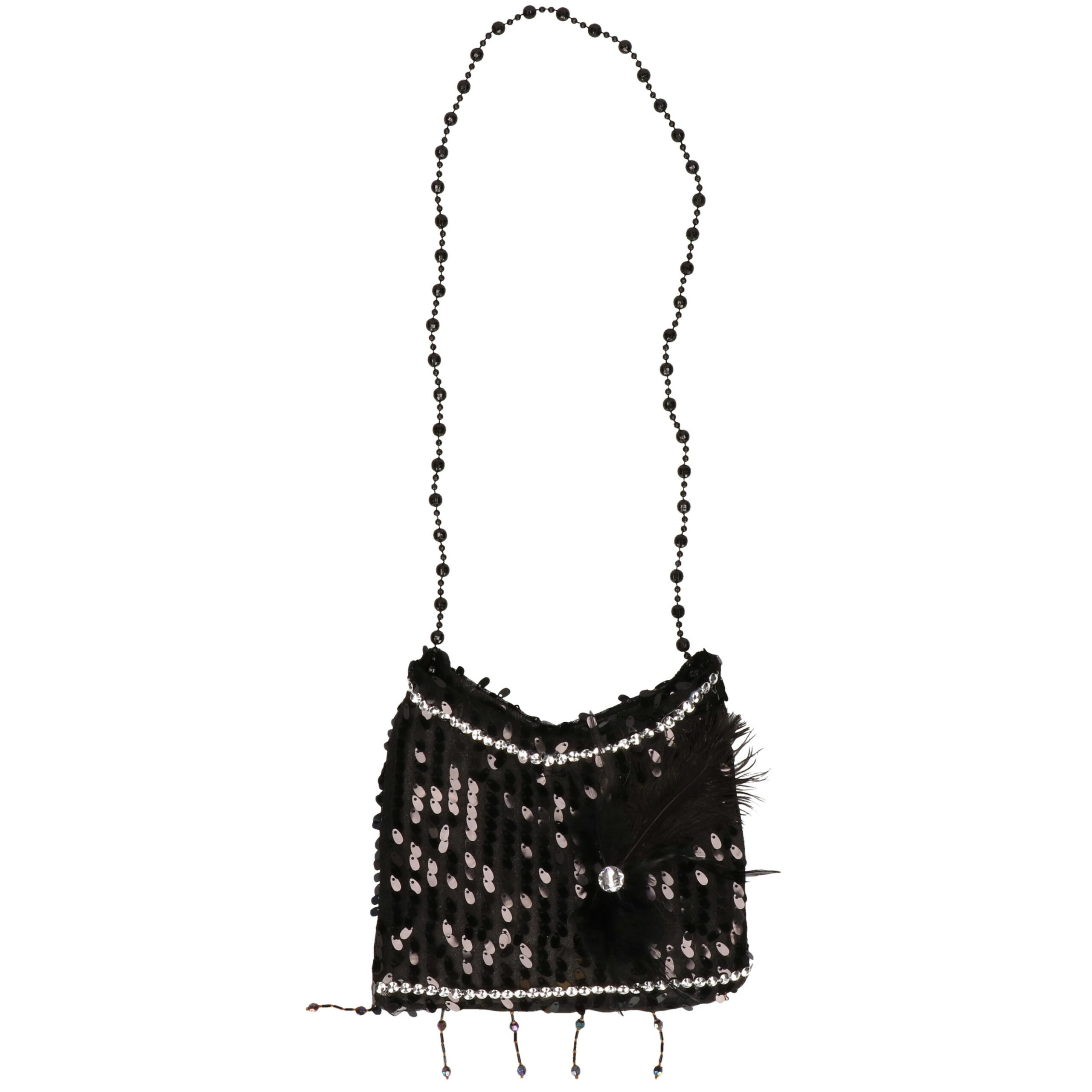 Charleston tasje met pailletten, kralen en veertje zwart voor dames foute party/carnaval. Jaren 20/Charleston tasje gemaakt van polyester. Op de voorkant zitten pailletten, aan de onderkant mooie glimmende kraaltjes en een zwart veertje in de vorm van een bloem aan de voorkant. Aantal vakken: 1.