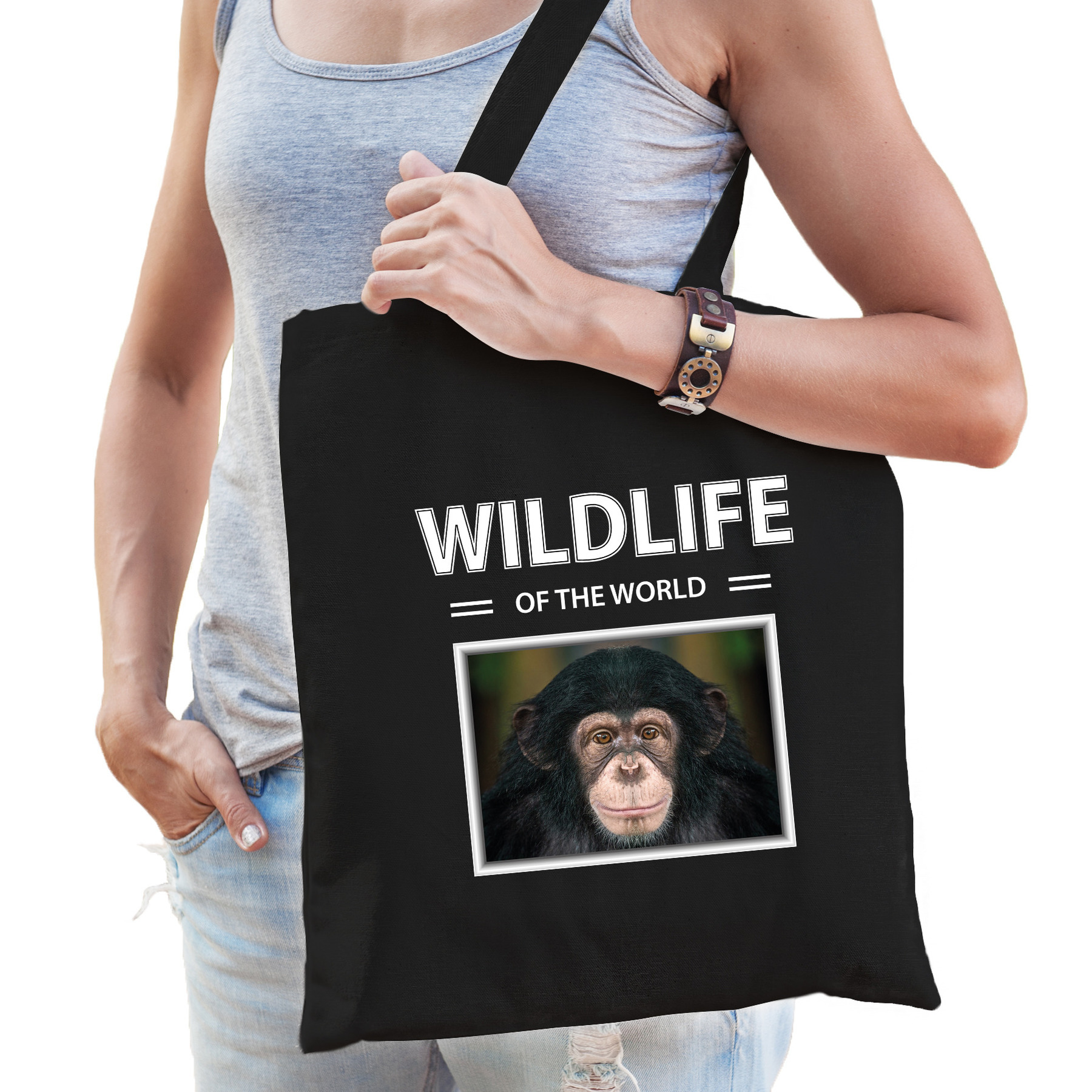 Aap tasje zwart voor volwassenen en kinderen. Op deze tas staat een Aap afbeelding en de tekst: wildlife of the world. Een musthave voor een echte dieren/ Aap liefhebber of iemand die alles van Chimpansee apen spaart. Erg leuk om cadeau te doen aan een echte Aap fan of gewoon om zelf te gebruiken!