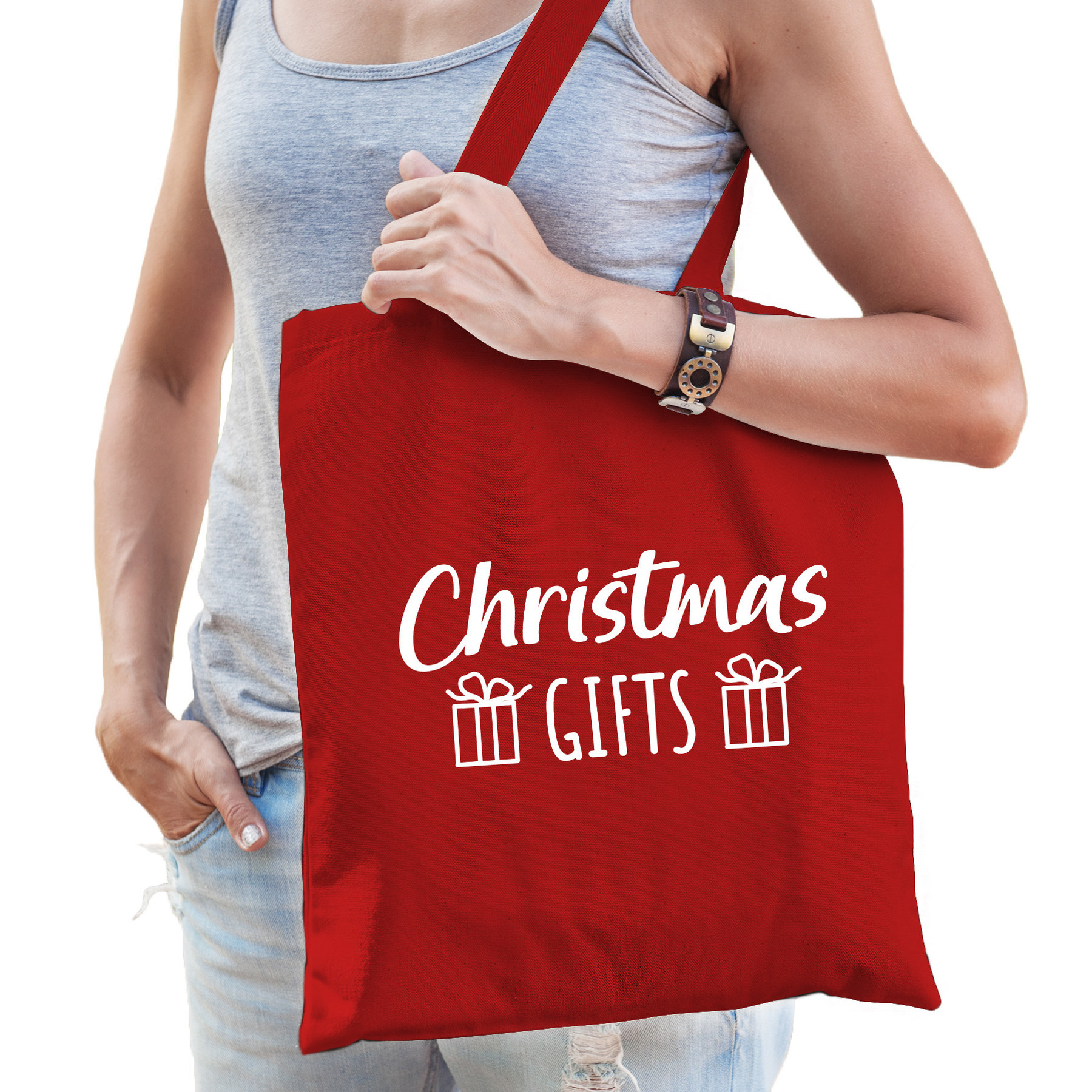 Christmas gifts katoenen tasje rood volwassenen. Op dit rode tasje staat de tekst: Christmas gifts. Leuk tasje om Kerst cadeaus in te doen of om te geven als een kado voor onder de Kerstboom. Formaat vak: 42 x 38 cm. Totale lengte inclusief hengsel: 67 cm. Materiaal: 100% katoen, 140 grams kwaliteit. Inhoud: 10 liter.