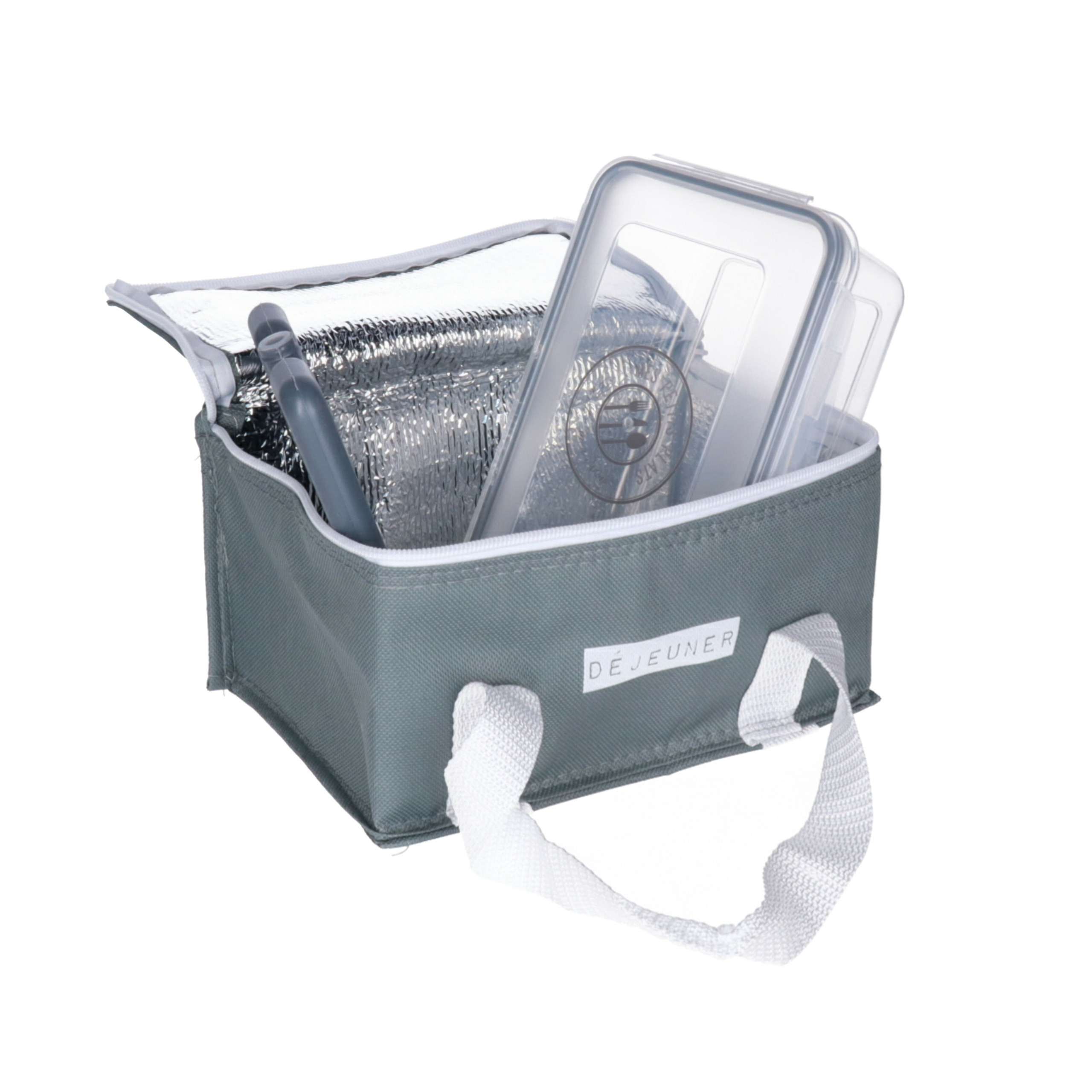 Klein formaat Koeltas Complete van Cook Concept met enkel compartiment voor lunch en voedsel. De set bevat ook een afsluitbare lunchbox en een plat koelelement. Stijlvolle kleine koeltas in met hoofdkleur grijs, voor het koelen van voedsel, en of om uw lunch in te bewaren. De koeltas heeft een isolerende laag aan de binnenzijde en is voorzien van een ritssluiting en korte hengsels. Inhoud: 3 liter. Materiaal: polyester/aluminium. Formaat ongeveer: 22 x 15 x 11 cm. Koeltassen, lunchtrommels, lunchbag, sixpack blikjes.