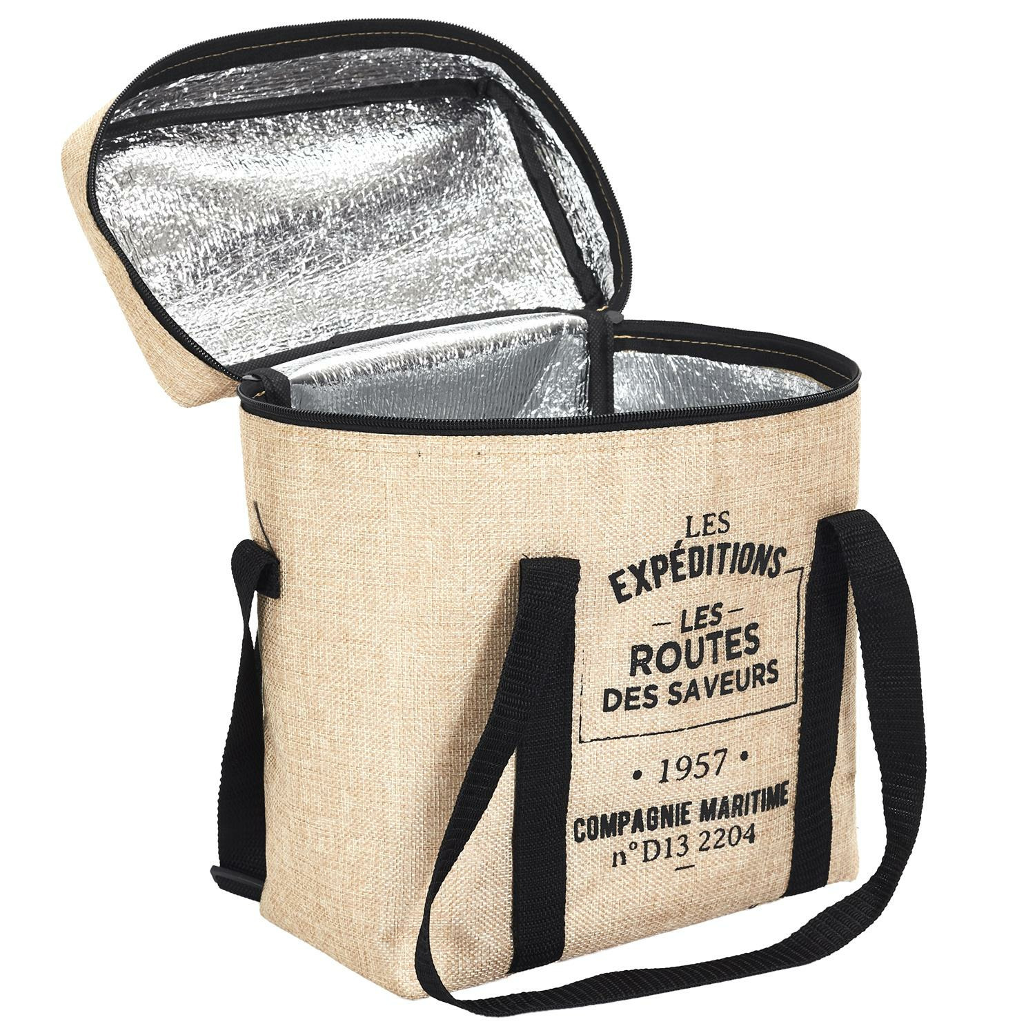Koeltas jute met franse teksten voor voedsel of drankjes. Koeltas in de kleur beige voor het koelen van voedsel en drank, of om uw lunch in te bewaren. De tas heeft een isolerende laag aan de binnenzijde en is voorzien van een ritssluiting en een korte hengsel in contrasterende kleur. Inhoud: 10 liter. Materiaal: polyester/aluminium. Formaat ongeveer: 25 x 14 x 30 cm. Koeltassen, lunchtrommels, lunchbag, blikjes koelen.
