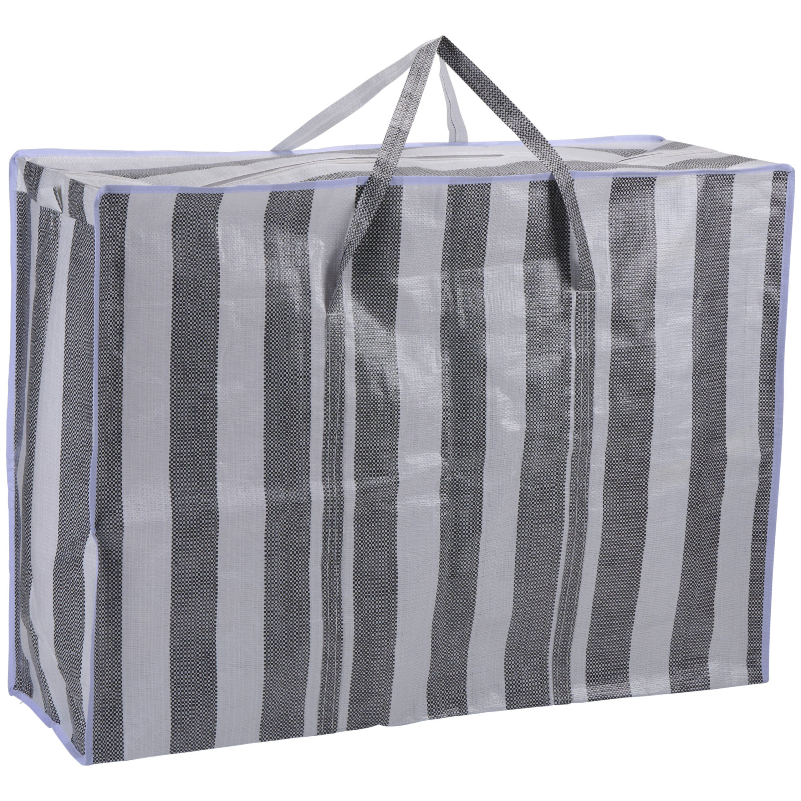 Dekentas met rits in de kleur grijs met een gestreept thema. Deze handige opbergtas met ritssluiting en handvaten is ideaal voor het bewaren van dekens, kussens of kleding. Ook te gebruiken als big shopper, boodschappentas of wastas, met een maximum gewicht van 25KG is deze veelzijdige opbergzak ook te gebruiken om speelgoed en andere dingen gemakkelijk mee te nemen. Berg je spullen netjes en stofvrij op in deze handige dekentas. Met deze opbergtassen kan je je spullen gemakkelijk opbergen in de kast of op zolder. Materiaal: polypropyleen. Formaat: 80 x 58 x 28 cm maat L.