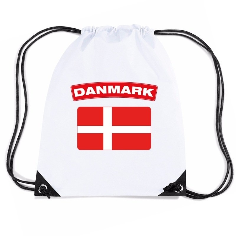 Denemarken nylon rugzak/ sporttas wit met rijgkoord, geschikt voor volwassenen en kinderen. Op dit witte rugzakje staat de vlag van Denemarken. De nylon gymtas is van waterafstotende stof en heeft rijgkoord. De inhoud van de gymtas is ongeveer 11 liter en de afmeting 45 x 34 cm.