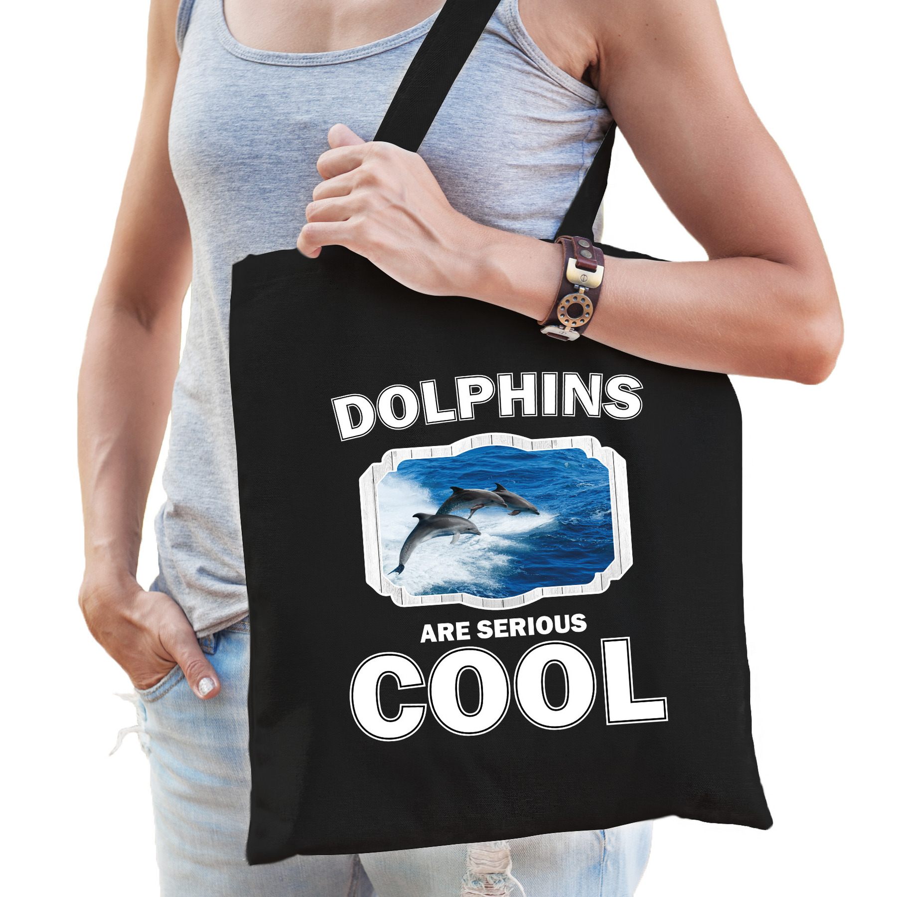 Dieren katoenen tasje dolfijn groep zwart voor volwassenen en kinderen. Op deze tas staat een dolfijnen afbeelding en de tekst: dolphins are serious cool. Een musthave voor een echte dieren/ dolfijnen liefhebber of iemand die alles van dolfijnen spaart. Erg leuk om cadeau te doen aan een echte dolfijnen fan of gewoon om zelf te gebruiken!