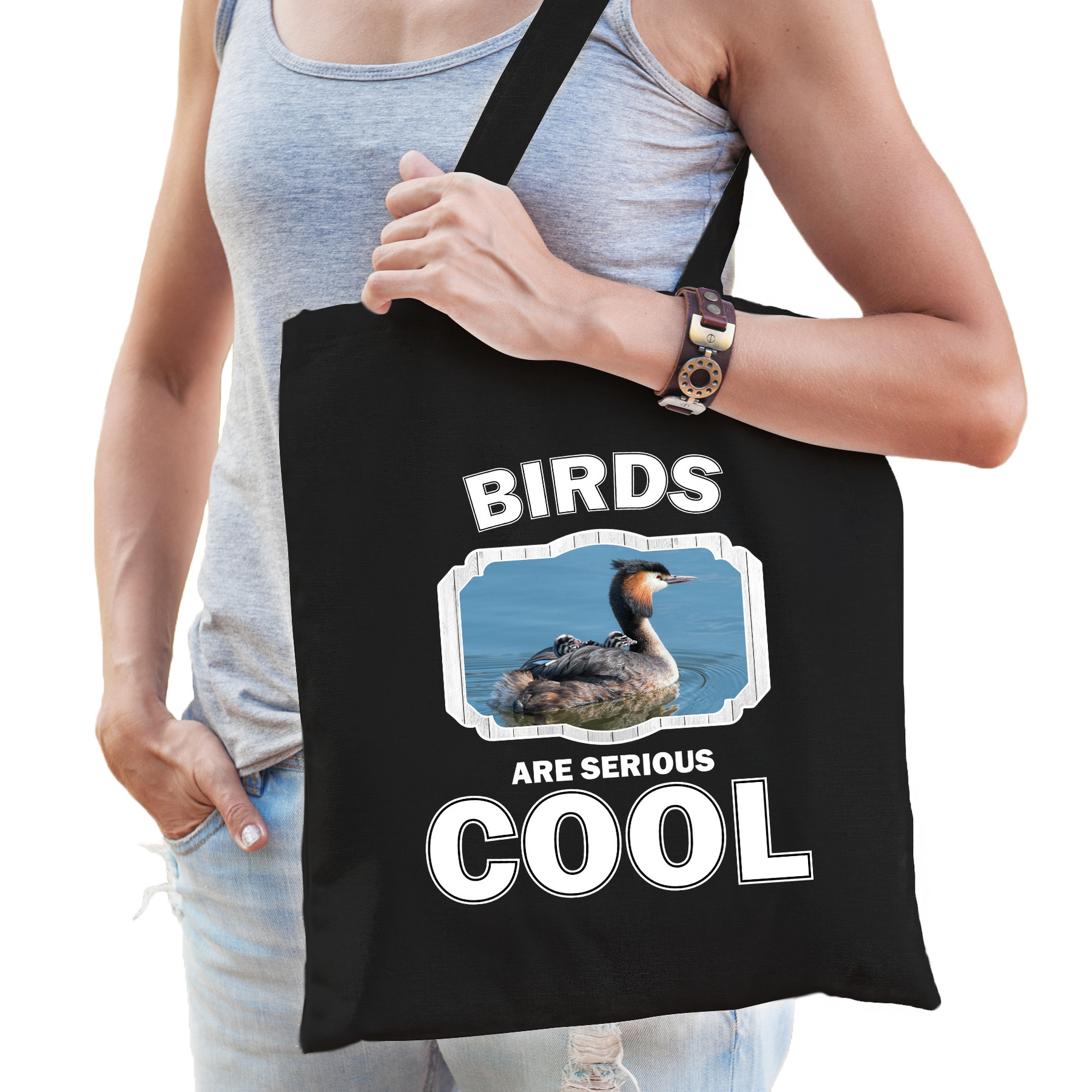Dieren katoenen tasje fuut vogel zwart voor volwassenen en kinderen. Op deze tas staat een vogels afbeelding en de tekst: birds are serious cool. Een musthave voor een echte dieren/ vogels liefhebber of iemand die alles van vogels spaart. Erg leuk om cadeau te doen aan een echte vogels fan of gewoon om zelf te gebruiken!