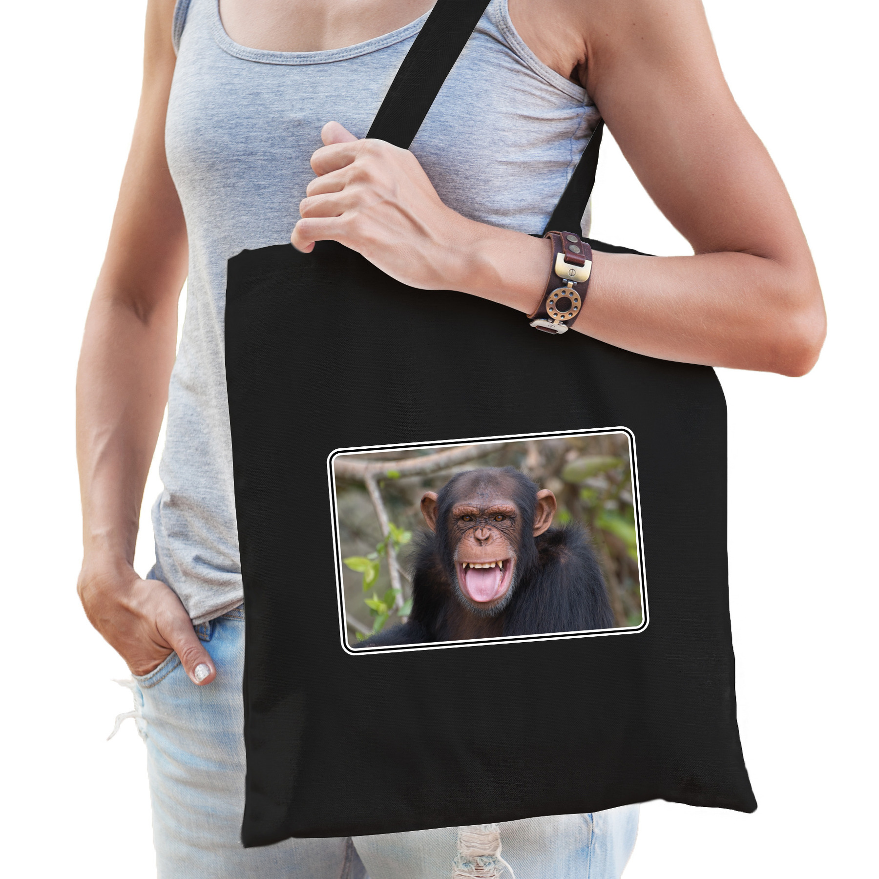 Dieren tas van katoen met apen foto zwart voor volwassenen. Dit tasje is bedrukt met een prachtige foto van een Chimpansee aap. Een toffe tas om cadeau te geven aan een dieren liefhebber of iemand die fan is van apen en de natuur.