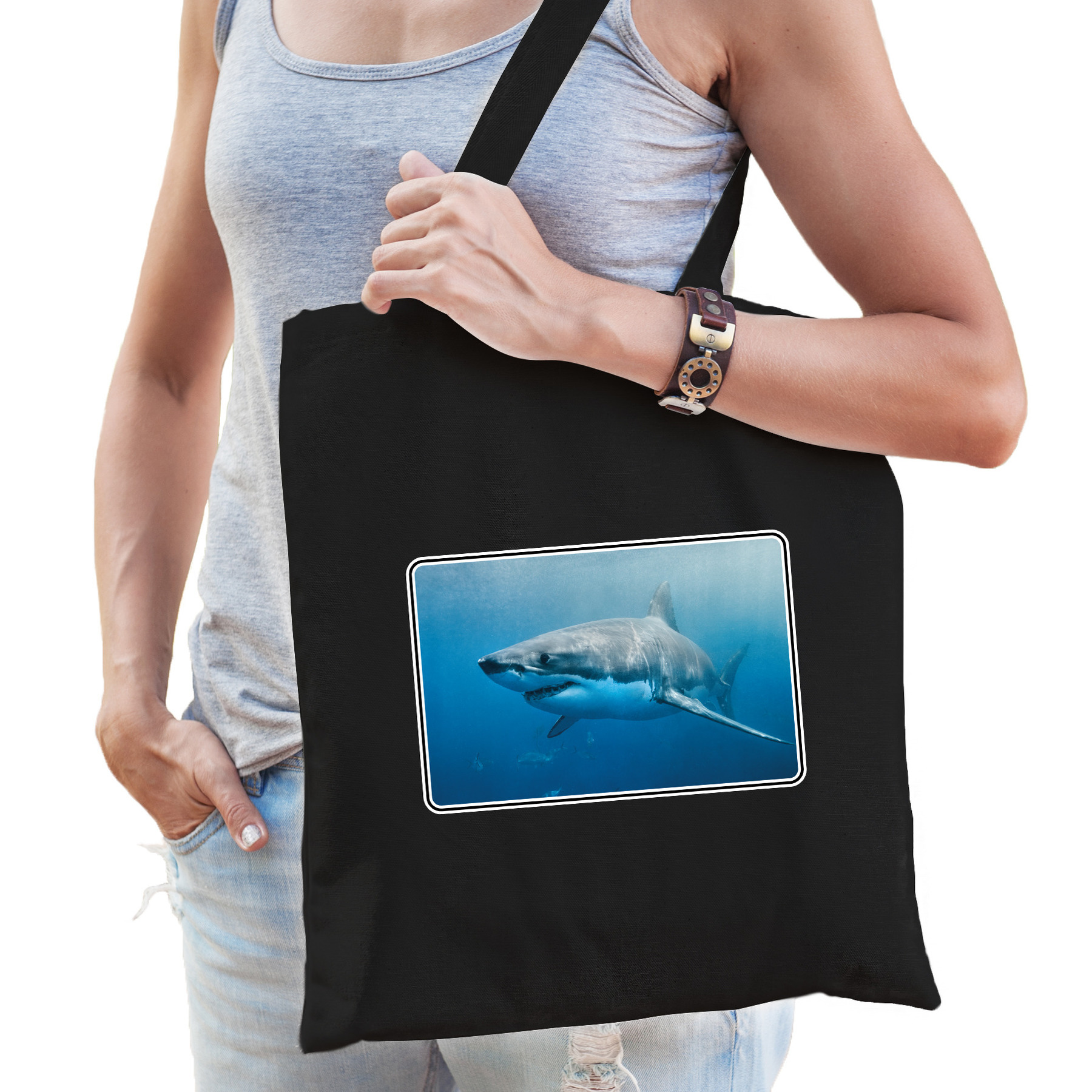 Dieren tas van katoen met haaien foto zwart voor volwassenen. Dit tasje is bedrukt met een prachtige foto van een haai. Een toffe tas om cadeau te geven aan een dieren liefhebber of iemand die fan is van haaien en de natuur.