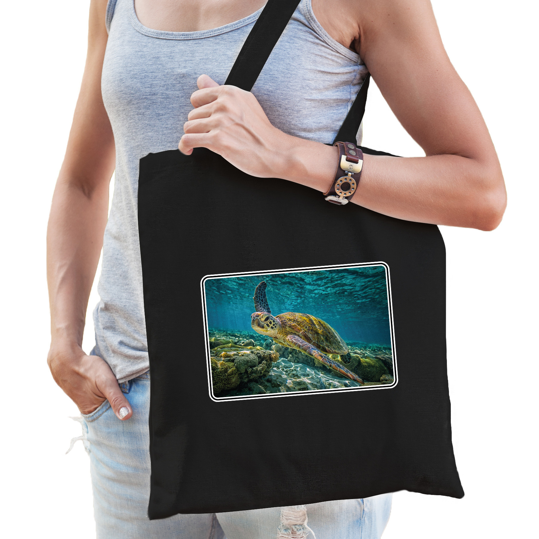 Dieren tas van katoen met schildpadden foto zwart voor volwassenen. Dit tasje is bedrukt met een prachtige foto van een schildpad. Een toffe tas om cadeau te geven aan een dieren liefhebber of iemand die fan is van zeeschildpadden en de natuur.
