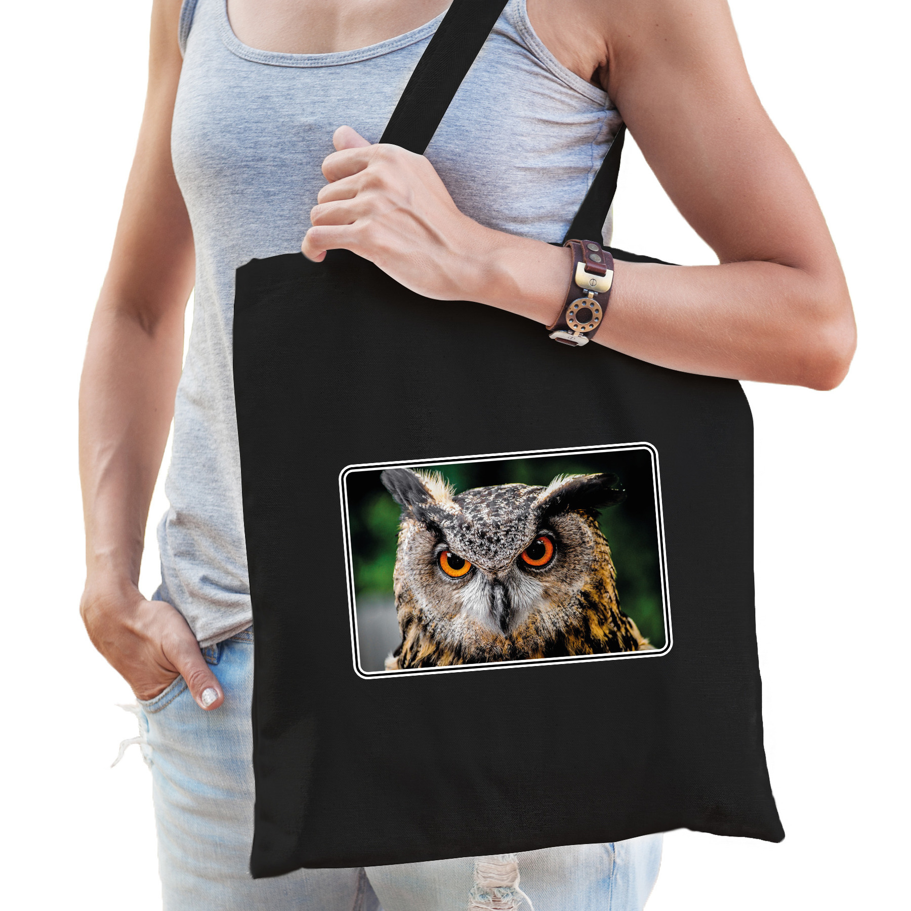Dieren tas van katoen met uilen foto zwart voor volwassenen. Dit tasje is bedrukt met een prachtige foto van een uil. Een toffe tas om cadeau te geven aan een dieren liefhebber of iemand die fan is van vogels, roofvogels, Oehoe uilen en de natuur.