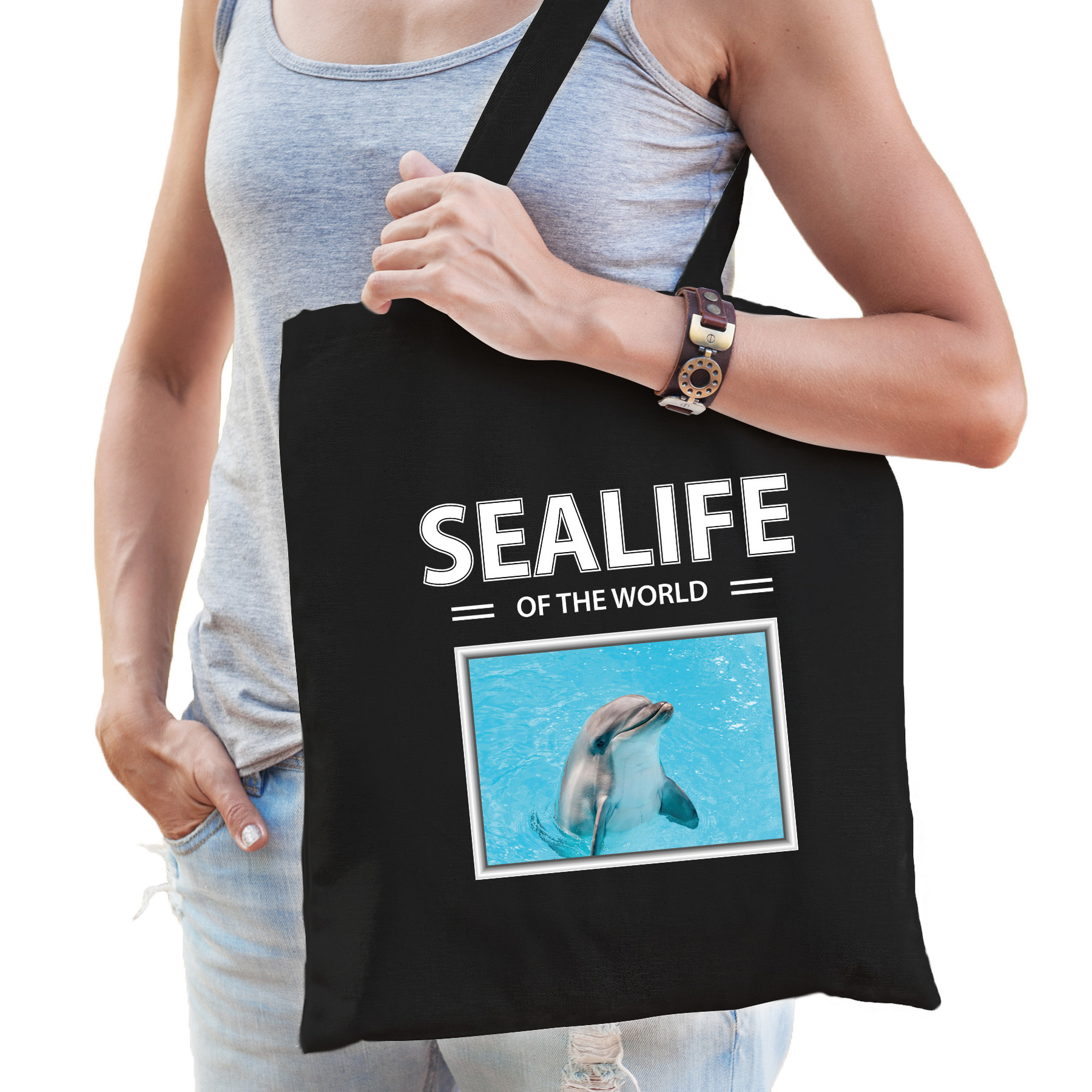 Dolfijn tasje zwart voor volwassenen en kinderen. Op deze tas staat een dolfijn afbeelding en de tekst: sealife of the world. Een musthave voor een echte dieren/ dolfijn liefhebber of iemand die alles van dolfijnen spaart. Erg leuk om cadeau te doen aan een echte dolfijn fan of gewoon om zelf te gebruiken!