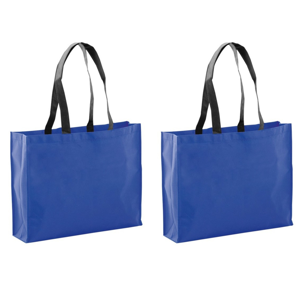 2 stuks draagtas/schoudertas/boodschappentas in de kleur blauw van 40 x 32 x 11 cm. Stevig gelamineerd, met lange hengsels en een draagvermogen van 9 kilo. Ook geschikt als goodie-bag/cadeautas. Gemaakt van polyester.
