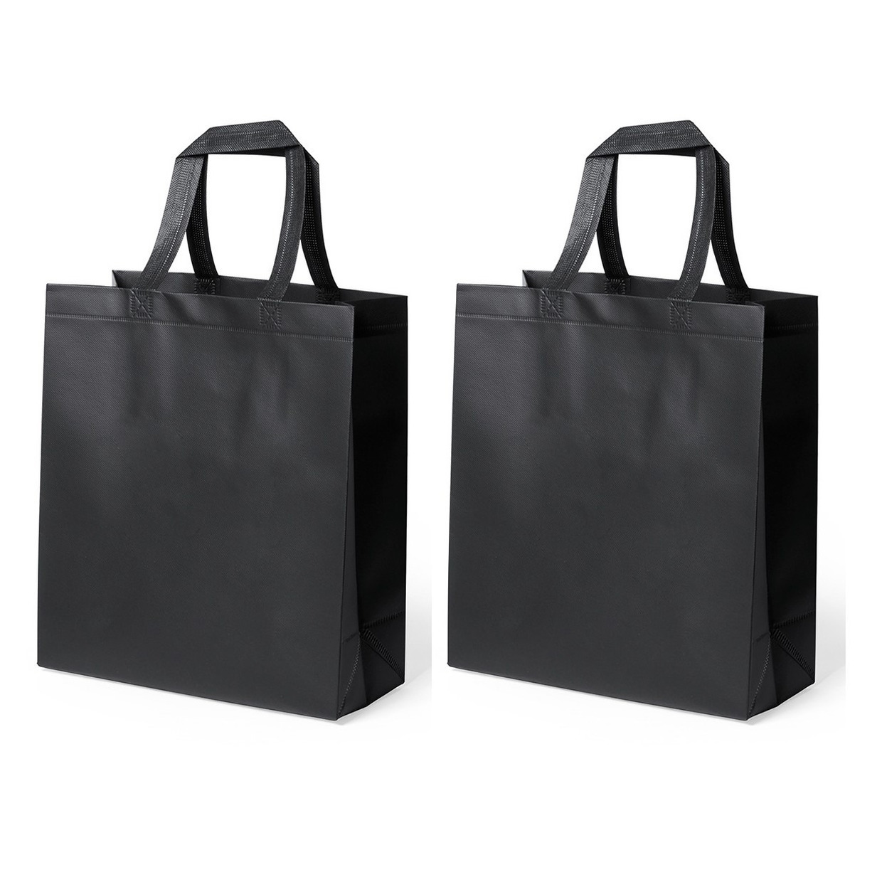 2 stuks draagtas/schoudertas/boodschappentas in de kleur zwart met afmeting van 35 x 40 x 15 cm. Stevig gelamineerd met een draagvermogen van 14 kilo. Ook geschikt als goodie-bag/cadeautas. Gemaakt van polyester stof.