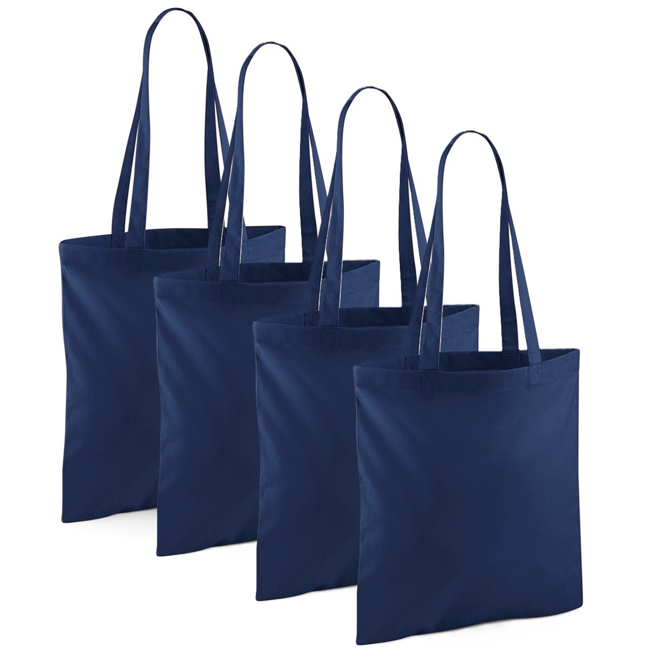 4x katoenen tasje in de kleur donkerblauw en afmetingen van 42 x 38 cm. Katoenen tasje met een inhoud van 10 liter. De tas kan gebruikt worden als boodschappentas, schoudertas, gymtas of als schooltas. Geschikt voor kinderen en volwassenen.