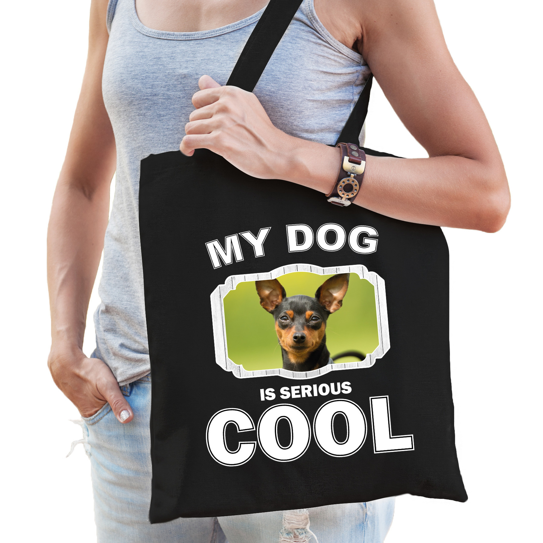Dwergpinscher honden tasje zwart volwassenen en kinderen. Op deze tas staat een Dwergpinscher afbeelding en de tekst: my dog is serious cool. Een musthave voor een echte dieren/ Dwergpinschers liefhebber of iemand die alles van honden spaart. Erg leuk om cadeau te doen aan een echte Dwergpinschers fan of gewoon om zelf te gebruiken!