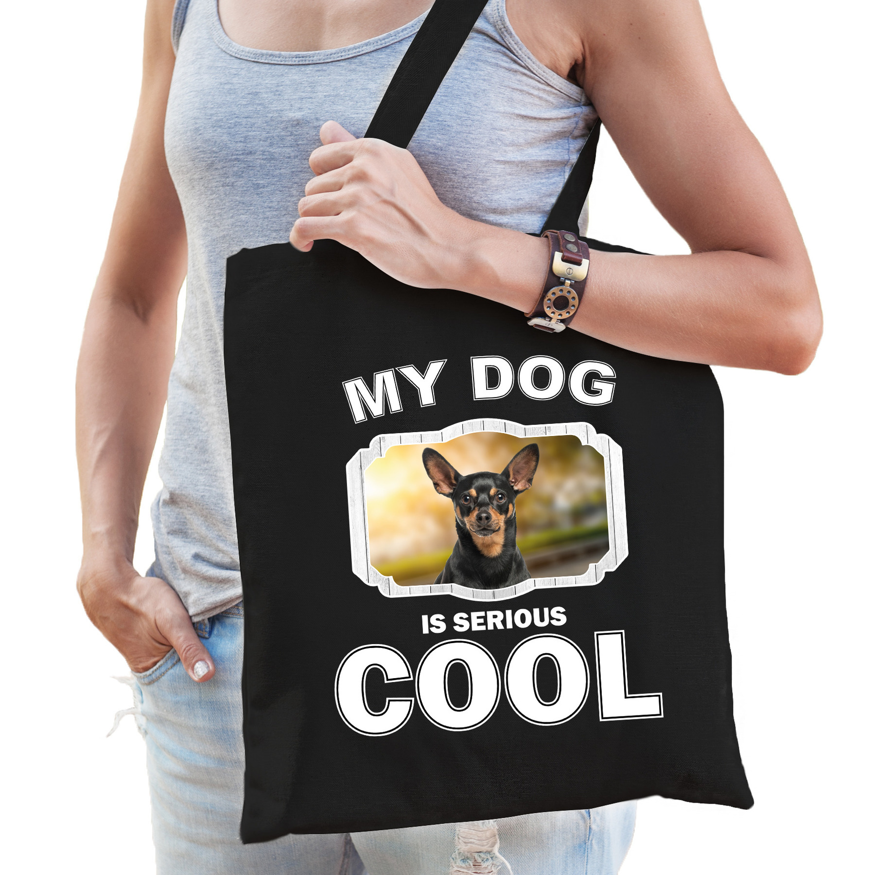 Dwergpinscher honden tasje zwart volwassenen en kinderen. Op deze tas staat een Dwergpinscher afbeelding en de tekst: my dog is serious cool. Een musthave voor een echte dieren/ Dwergpinschers liefhebber of iemand die alles van honden spaart. Erg leuk om cadeau te doen aan een echte Dwergpinschers fan of gewoon om zelf te gebruiken!