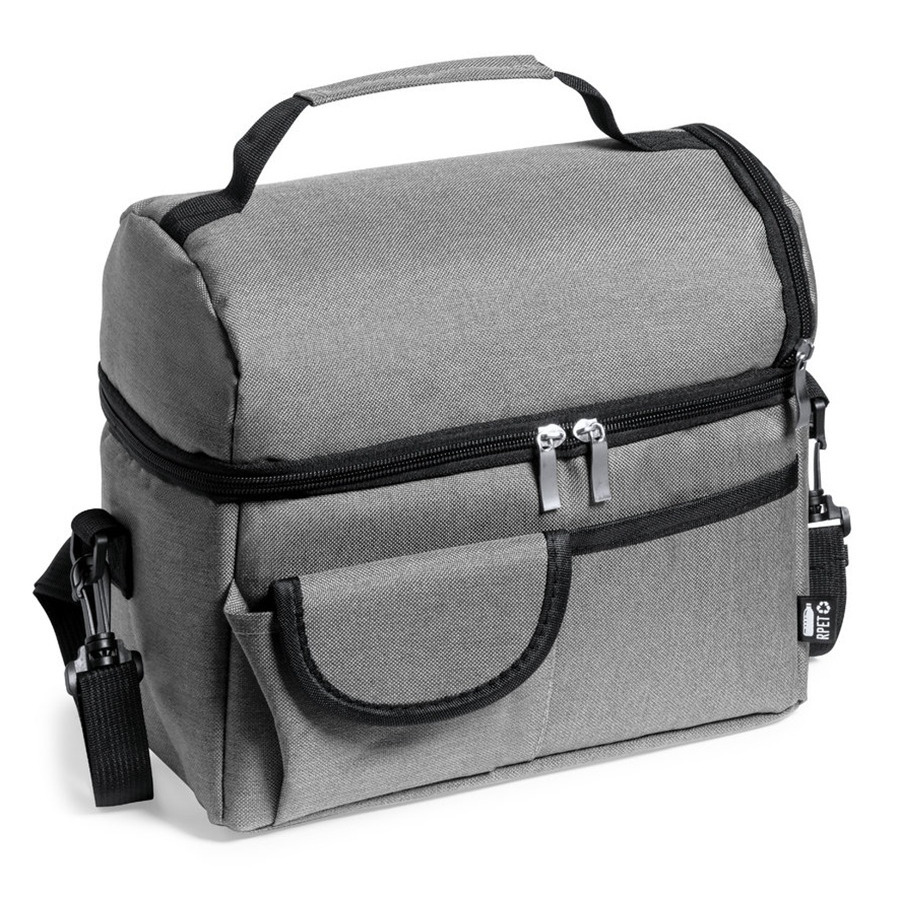 Koeltas Easy Travel met dubbel koel compartiment voor voedsel of drankjes. Koeltas in de kleur grijs voor het koelen van voedsel en drank, en of om uw lunch in te bewaren. De koeltas heeft een isolerende laag aan de binnenzijde en is voorzien van een ritssluiting en een korte hengsel en verstelbare schouderband. Inhoud: 12 liter. Materiaal: polyester/aluminium. Formaat ongeveer: 25 x 15 x 24 cm. Koeltassen, lunchtrommels, lunchbag, blikjes en flessen koelen. Achterzak van elastisch gaas en twee voorzakken, waarvan ??n met klittenbandsluiting.
