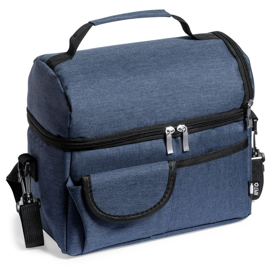 Koeltas Easy Travel met dubbel koel compartiment voor voedsel of drankjes. Koeltas in de kleur Blauw voor het koelen van voedsel en drank, en of om uw lunch in te bewaren. De koeltas heeft een isolerende laag aan de binnenzijde en is voorzien van een ritssluiting en een korte hengsel en verstelbare schouderband. Inhoud: 12 liter. Materiaal: polyester/aluminium. Formaat ongeveer: 25 x 15 x 24 cm. Koeltassen, lunchtrommels, lunchbag, blikjes en flessen koelen. Achterzak van elastisch gaas en twee voorzakken, waarvan ??n met klittenbandsluiting.