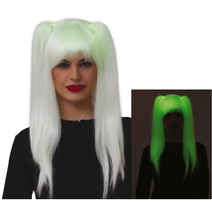 Halloween thema Glow in the dark verkleedpruik voor dames, lang haar met hooggeplaatste staartjes in de kleur blond. Lange lichtgevende dames pruik als toevoeging op uw verkleedkleding kostuum of jurk. Deze pruik kleurt groen in het donker. Vergeet vooral ook de verkleed accessoires niet zoals sieraden, hoedjes, diadeems en tassen. Geschikt voor de horror verkleed thema’s zoals: Heksen, Vampier, Zombie, Spoken, dark lady/queen.